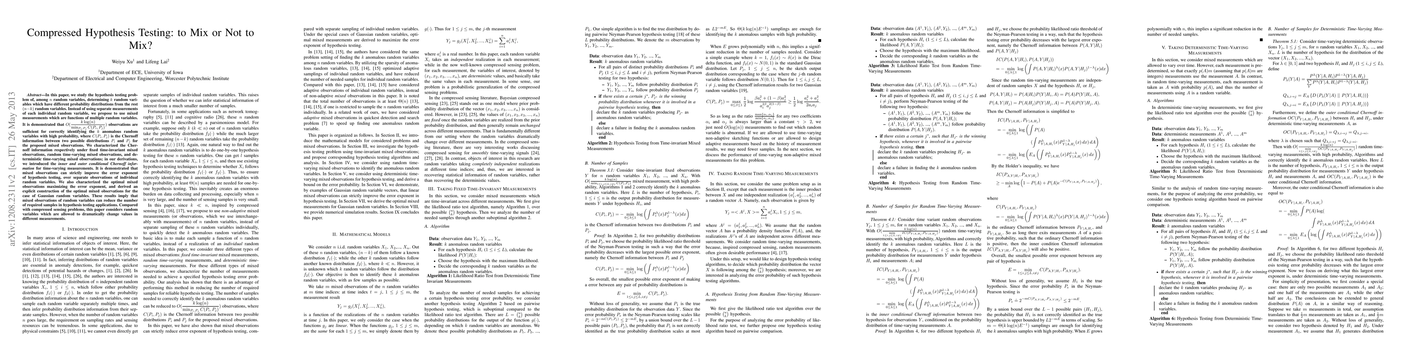 In this paper, we study the hypothesis testing problem of, among $n$ random variables, determining $k$ random variables which have different probability distributions from the rest $(n-k)$ random variables. Instead of using separate measurements of each individual random variable, we propose to use mixed measurements which are functions of multiple random variables. It is demonstrated that $O({\displaystyle \frac{k \log(n)}{\min_{P_i, P_j} C(P_i, P_j)}})$ observations are sufficient for correctly identifying the $k$ anomalous random variables with high probability, where $C(P_i, P_j)$ is the Chernoff information between two possible distributions $P_i$ and $P_j$ for the proposed mixed observations. We characterized the Chernoff information respectively under fixed time-invariant mixed observations, random time-varying mixed observations, and deterministic time-varying mixed observations; in our derivations, we introduced the \emph{inner and outer conditional Chernoff information} for time-varying measurements. It is demonstrated that mixed observations can strictly improve the error exponent of hypothesis testing, over separate observations of individual random variables. We also characterized the optimal mixed observations maximizing the error exponent, and derived an explicit construction of the optimal mixed observations for the case of Gaussian random variables. These results imply that mixed observations of random variables can reduce the number of required samples in hypothesis testing applications. Compared with compressed sensing problems, this paper considers random variables which are allowed to dramatically change values in different measurements.