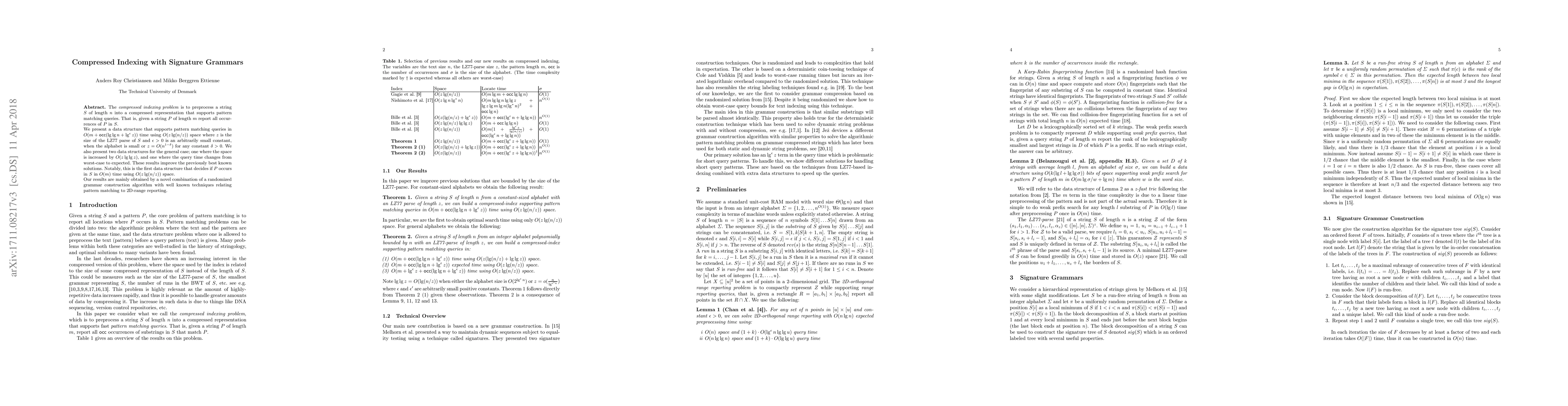 The paper presents a novel data structure for compressed indexing using signature grammars, which supports pattern matching queries efficiently. It combines a randomized grammar construction algorithm with known techniques for pattern matching and 2D-range reporting.