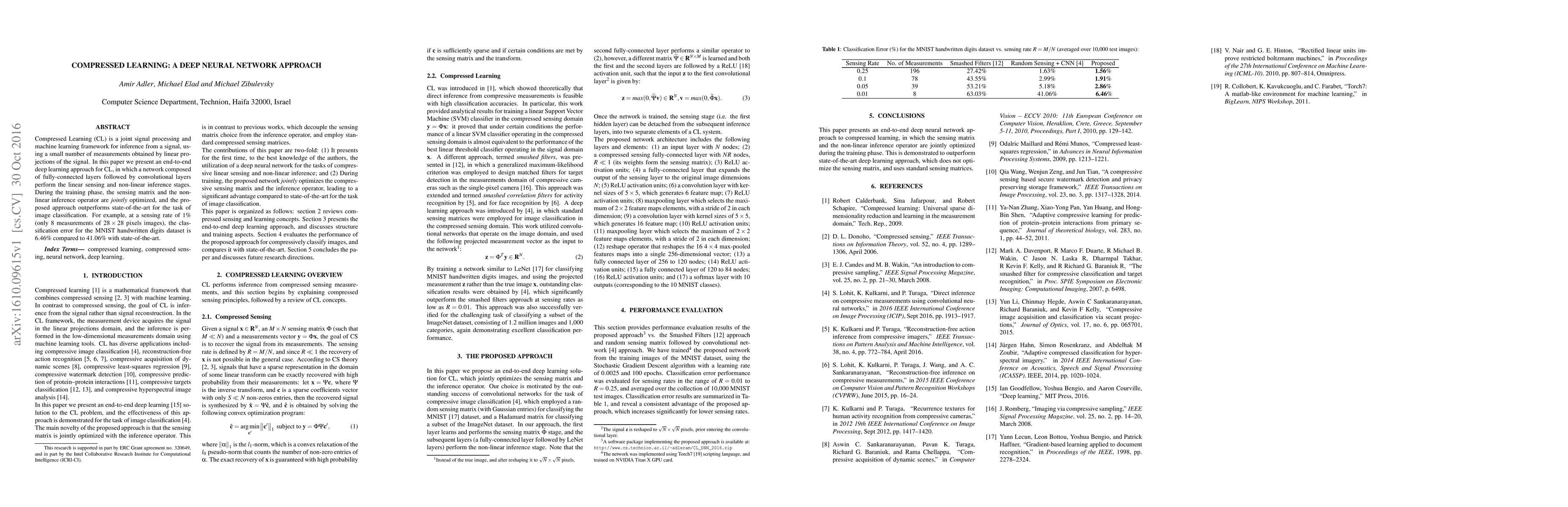 This paper introduces a deep learning approach for Compressed Learning, where a network combining fully-connected and convolutional layers performs linear sensing and non-linear inference. The method jointly optimizes the sensing matrix and inference operator, achieving superior performance in image classification, such as a 6.46% error rate on MNIST at a 1% sensing rate.