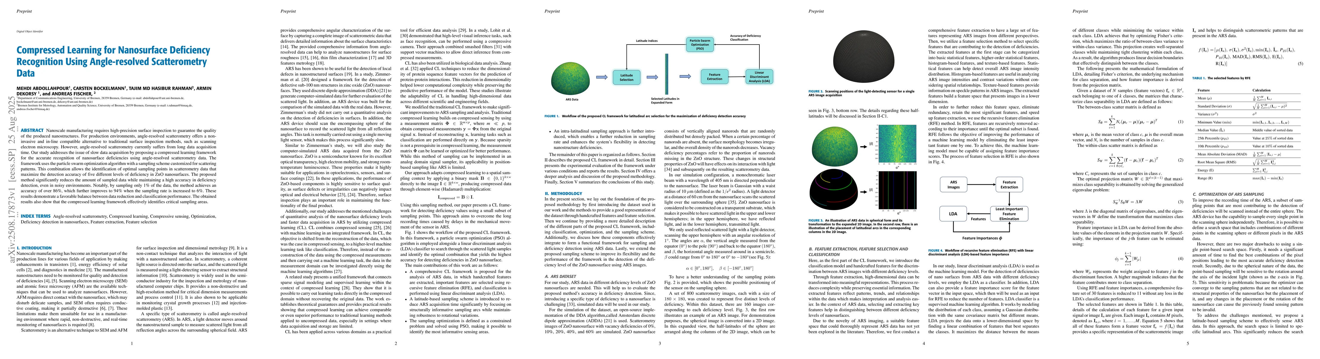 Nanoscale manufacturing requires high-precision surface inspection to guarantee the quality of the produced nanostructures. For production environments, angle-resolved scatterometry offers a non- invasive and in-line compatible alternative to traditional surface inspection methods, such as scanning electron microscopy. However, angle-resolved scatterometry currently suffers from long data acquisition time. Our study addresses the issue of slow data acquisition by proposing a compressed learning framework for the accurate recognition of nanosurface deficiencies using angle-resolved scatterometry data. The framework uses the particle swarm optimization algorithm with a sampling scheme customized for scattering patterns. This combination allows the identification of optimal sampling points in scatterometry data that maximize the detection accuracy of five different levels of deficiency in ZnO nanosurfaces. The proposed method significantly reduces the amount of sampled data while maintaining a high accuracy in deficiency detection, even in noisy environments. Notably, by sampling only 1% of the data, the method achieves an accuracy of over 86%, which further improves to 94% when the sampling rate is increased to 6%. These results demonstrate a favorable balance between data reduction and classification performance. The obtained results also show that the compressed learning framework effectively identifies critical sampling areas.