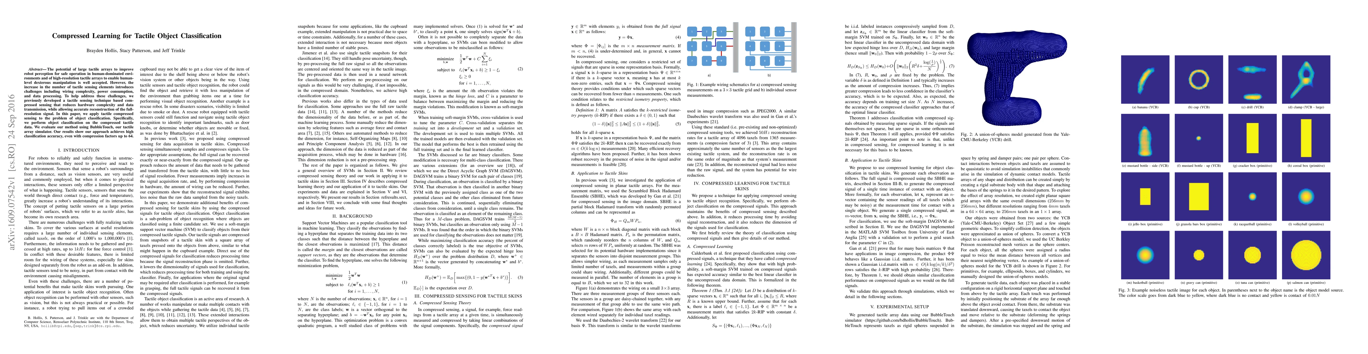 The paper proposes a technique for applying compressed sensing to tactile object recognition, performing object classification on compressed signals, which maintains benefits of compressed sensing while reducing processing time and signal dimensionality for classification.