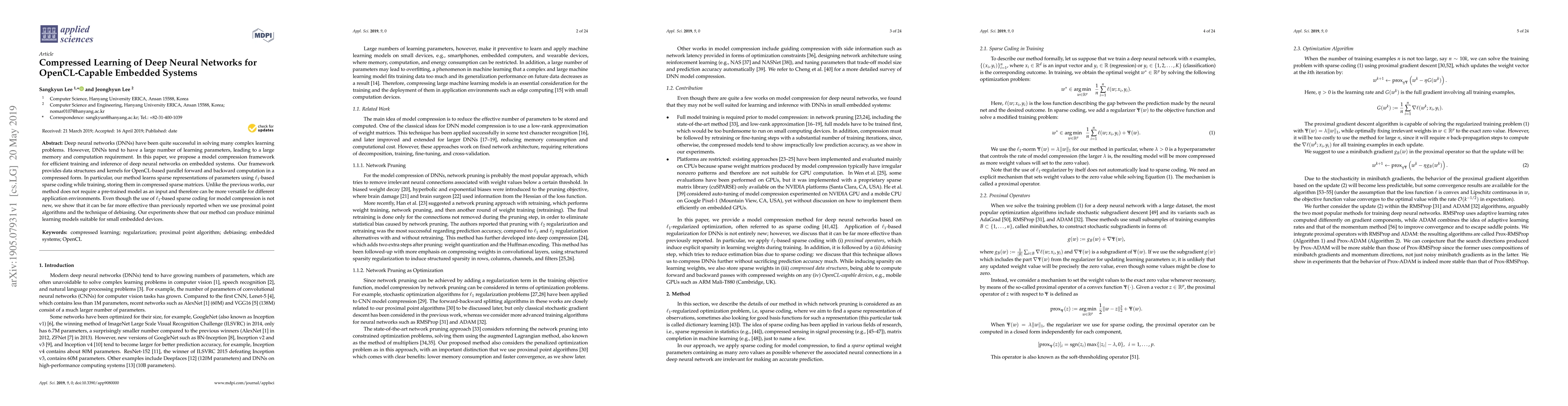 This paper proposes a model compression framework for efficient training and inference of deep neural networks on embedded systems using OpenCL. It employs $\ell_1$-based sparse coding with proximal point algorithms and debiasing techniques to achieve effective compression without requiring a pre-trained model, demonstrating minimal model size suitable for small devices.