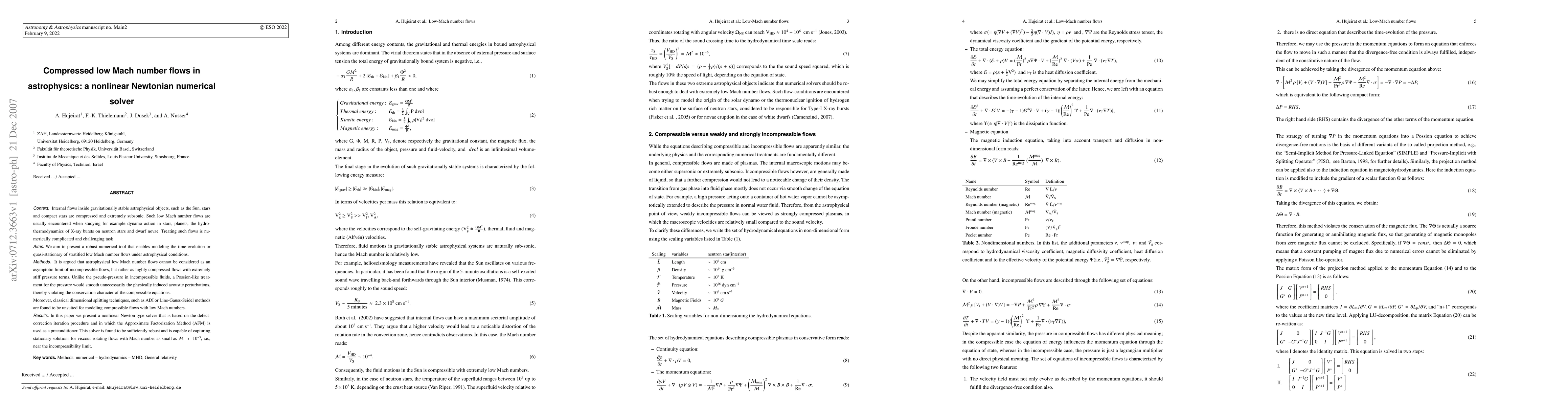 This paper introduces a nonlinear Newtonian numerical solver for modeling compressed, low Mach number flows in astrophysical objects, addressing the challenges of simulating extremely subsonic flows. The solver employs a defect-correction iteration with the Approximate Factorization Method as a preconditioner, demonstrating robustness and accuracy for flows with Mach numbers as low as $\mcal{M} \approx 10^{-3}$.