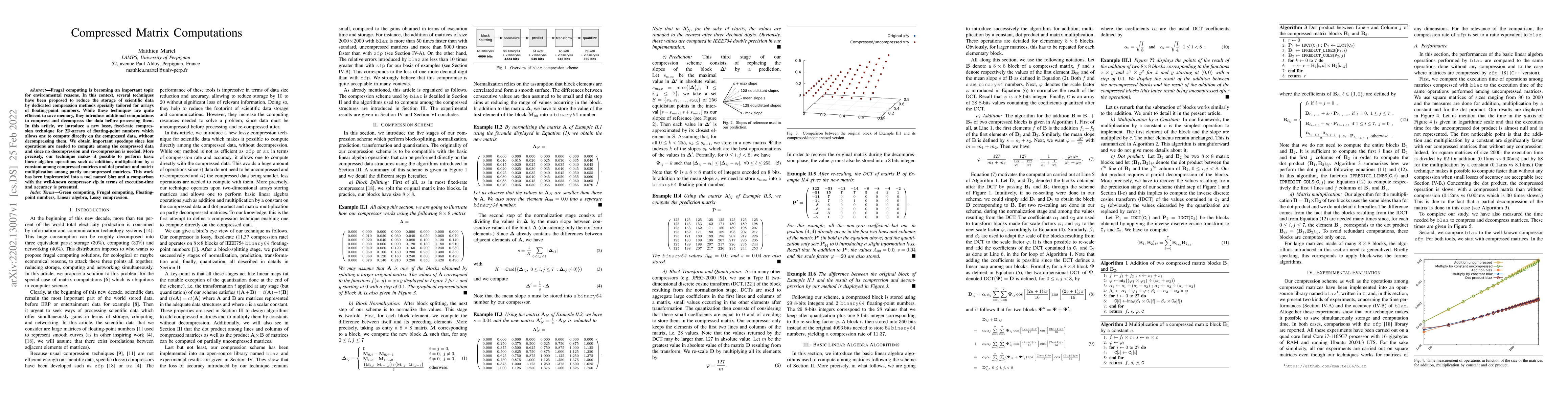 Frugal computing is becoming an important topic for environmental reasons. In this context, several techniques have been proposed to reduce the storage of scientific data by dedicated compression methods specially tailored for arrays of floating-point numbers. While these techniques are quite efficient to save memory, they introduce additional computations to compress and decompress the data before processing them. In this article, we introduce a new lossy, fixed-rate compression technique for 2D-arrays of floating-point numbers which allows one to compute directly on the compressed data, without decompressing them. We obtain important speedups since less operations are needed to compute among the compressed data and since no decompression and re-compression is needed. More precisely, our technique makes it possible to perform basic linear algebra operations such as addition, multiplication by a constant among compressed matrices and dot product and matrix multiplication among partly uncompressed matrices. This work has been implemented into a tool named blaz and a comparison with the well-known compressor zfp in terms of execution-time and accuracy is presented.