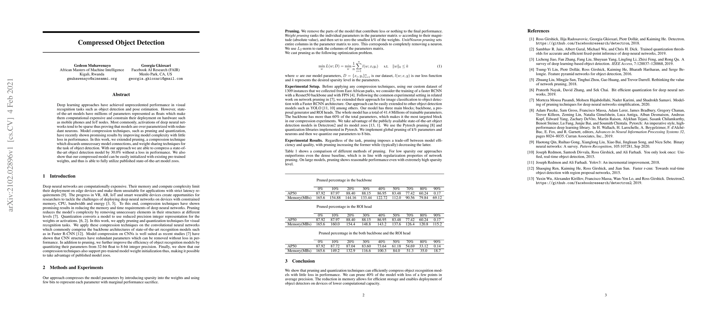 Deep learning approaches have achieved unprecedented performance in visual recognition tasks such as object detection and pose estimation. However, state-of-the-art models have millions of parameters represented as floats which make them computationally expensive and constrain their deployment on hardware such as mobile phones and IoT nodes. Most commonly, activations of deep neural networks tend to be sparse thus proving that models are over parametrized with redundant neurons. Model compression techniques, such as pruning and quantization, have recently shown promising results by improving model complexity with little loss in performance. In this work, we extended pruning, a compression technique that discards unnecessary model connections, and weight sharing techniques for the task of object detection. With our approach, we are able to compress a state-of-the-art object detection model by 30.0% without a loss in performance. We also show that our compressed model can be easily initialized with existing pre-trained weights, and thus is able to fully utilize published state-of-the-art model zoos.