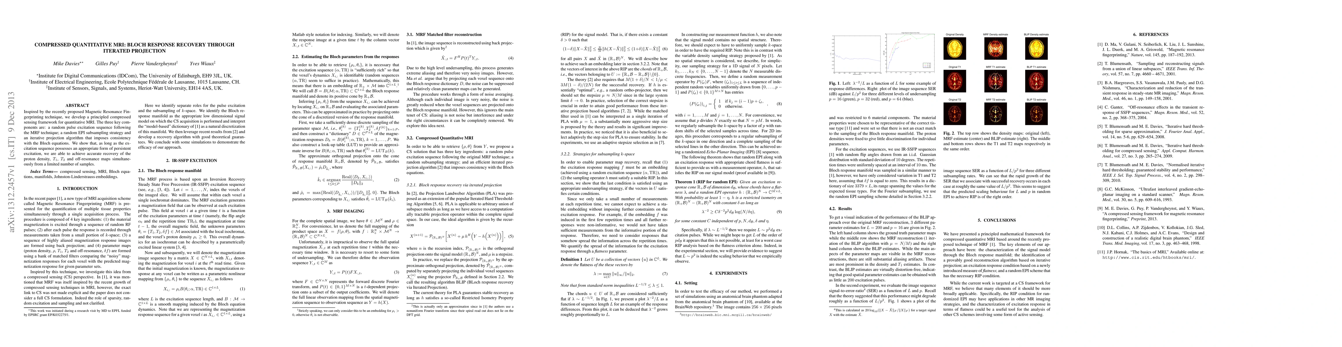 Inspired by the recently proposed Magnetic Resonance Fingerprinting technique, we develop a principled compressed sensing framework for quantitative MRI. The three key components are: a random pulse excitation sequence following the MRF technique; a random EPI subsampling strategy and an iterative projection algorithm that imposes consistency with the Bloch equations. We show that, as long as the excitation sequence possesses an appropriate form of persistent excitation, we are able to achieve accurate recovery of the proton density, $T_1$, $T_2$ and off-resonance maps simultaneously from a limited number of samples.