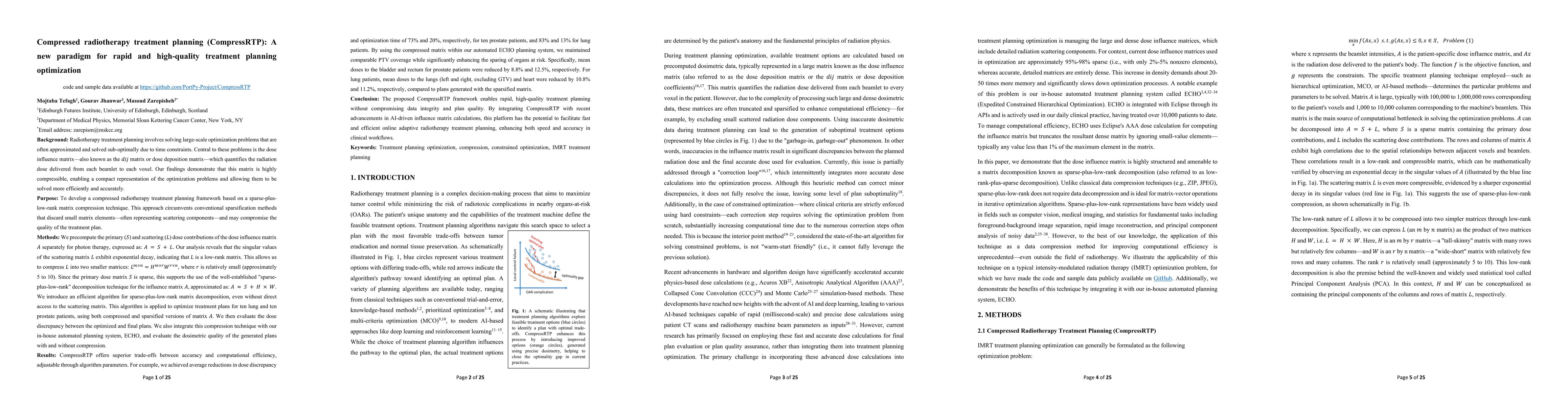 This research introduces Compressed Radiotherapy Treatment Planning (CompressRTP), a new optimization method that leverages the compressibility of the dose influence matrix to enhance both efficiency and accuracy in radiotherapy planning. By decomposing the matrix into sparse and low-rank components, the authors develop an efficient algorithm for optimizing treatment plans, demonstrating improved dosimetric quality and faster computation times in clinical cases.