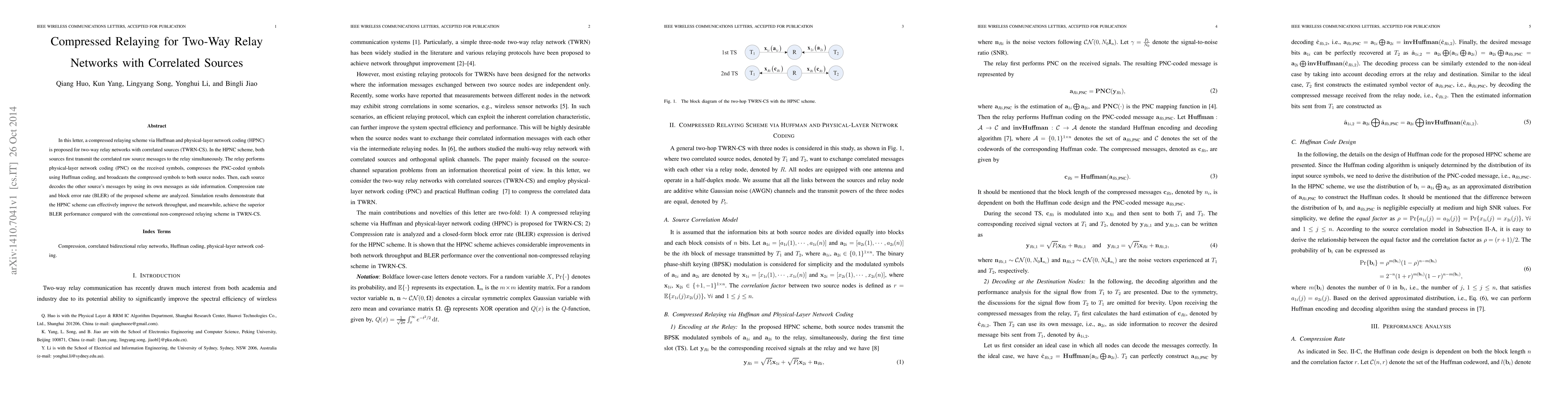 The paper proposes a compressed relaying scheme, HPNC, for two-way relay networks with correlated sources. This scheme combines Huffman coding and physical-layer network coding, improving network throughput and providing superior block error rate performance compared to conventional non-compressed relaying schemes.