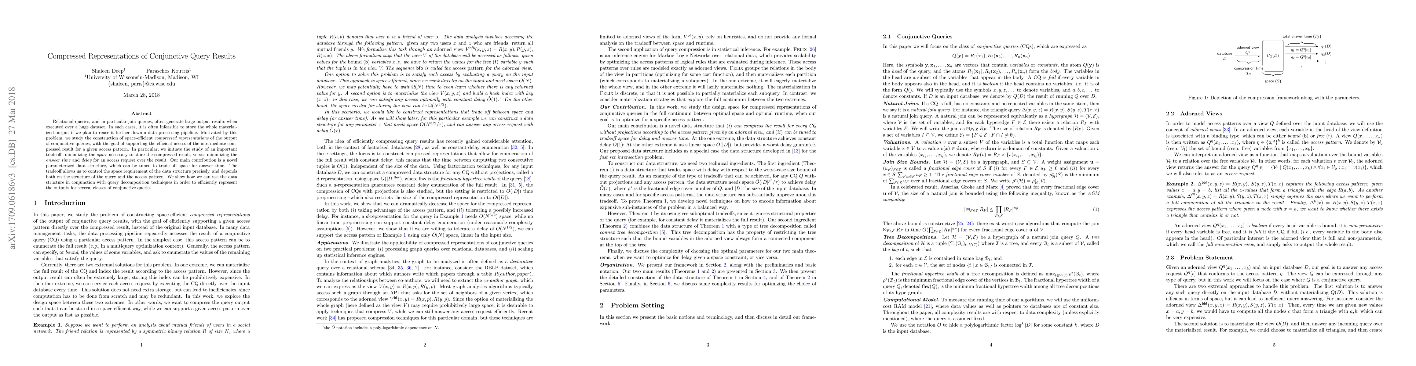 This paper proposes a novel data structure to create space-efficient compressed representations of conjunctive query results, balancing storage space against access time. The study introduces a tunable parameterized structure to manage this tradeoff, enabling efficient query decomposition and result access for various query types.
