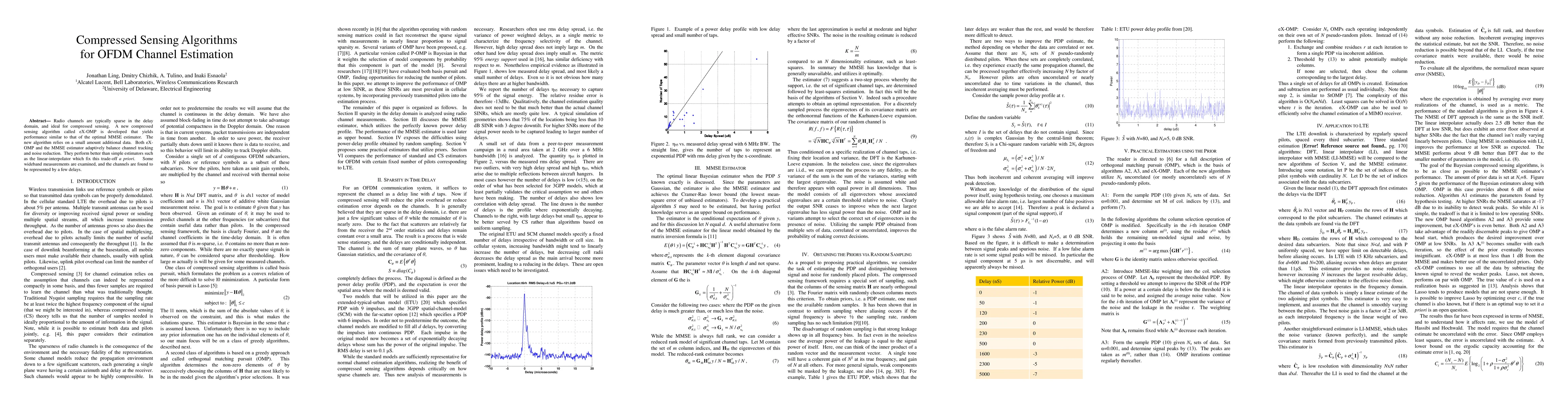 Radio channels are typically sparse in the delay domain, and ideal for compressed sensing. A new compressed sensing algorithm called eX-OMP is developed that yields performance similar to that of the optimal MMSE estimator. The new algorithm relies on a small amount additional data. Both eX-OMP and the MMSE estimator adaptively balance channel tracking and noise reduction. They perform better than simple estimators such as the linear-interpolator which fix this trade-off a priori. Some wideband measurements are examined, and the channels are found to be represented by a few delays.