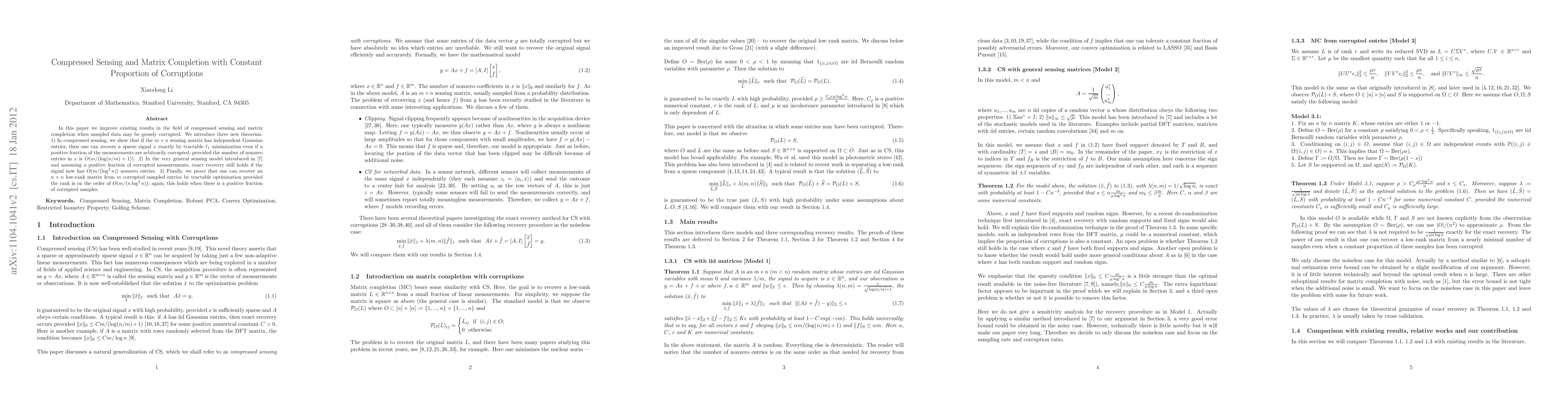 This paper presents advancements in compressed sensing and matrix completion under data corruption. It introduces theorems showing exact recovery of sparse signals and low-rank matrices via tractable optimization, even when a constant proportion of measurements or entries are grossly corrupted.
