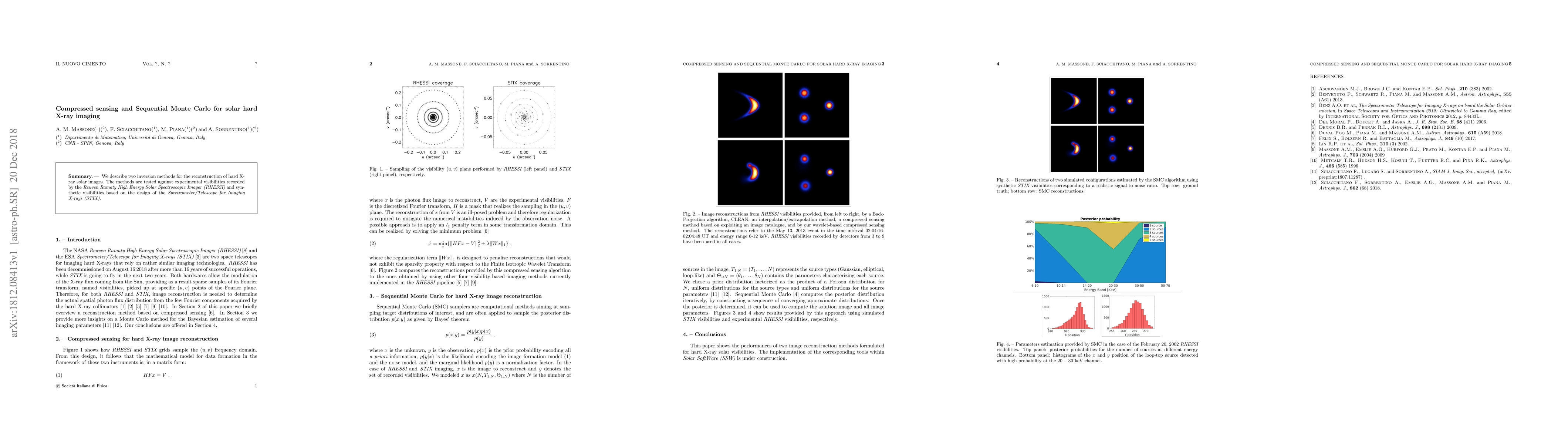 This paper proposes two inversion methods—compressed sensing and Sequential Monte Carlo—for reconstructing hard X-ray solar images, validated using data from RHESSI and synthetic data from STIX. The goal is to improve imaging accuracy for solar hard X-ray observations.