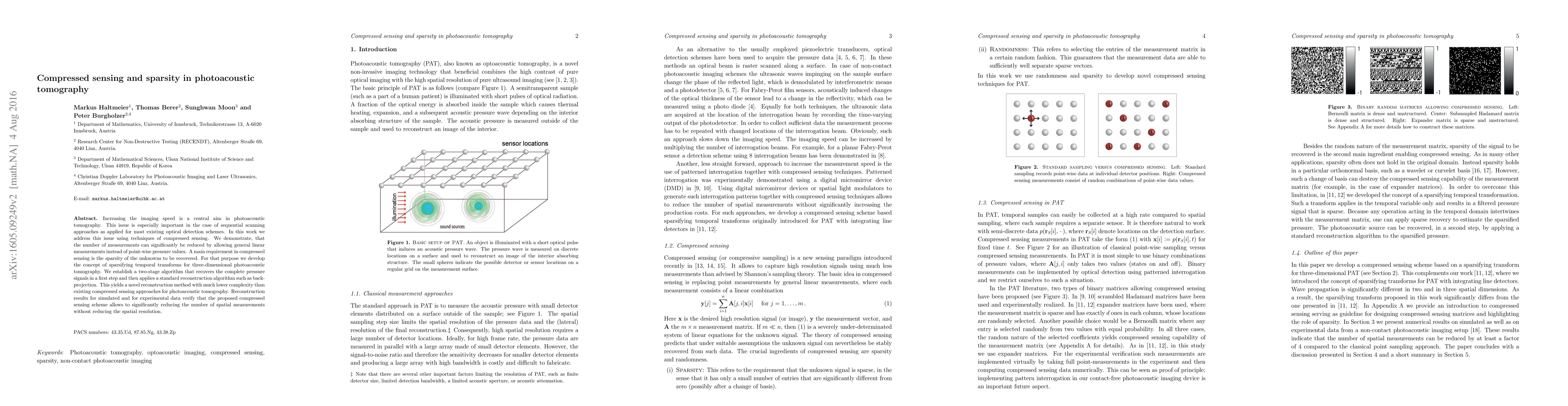 This paper presents a novel compressed sensing technique for speeding up photoacoustic tomography by reducing the number of required measurements through sparsity-driven reconstruction. It introduces sparsifying temporal transforms and a two-stage algorithm to achieve lower complexity and maintain spatial resolution.