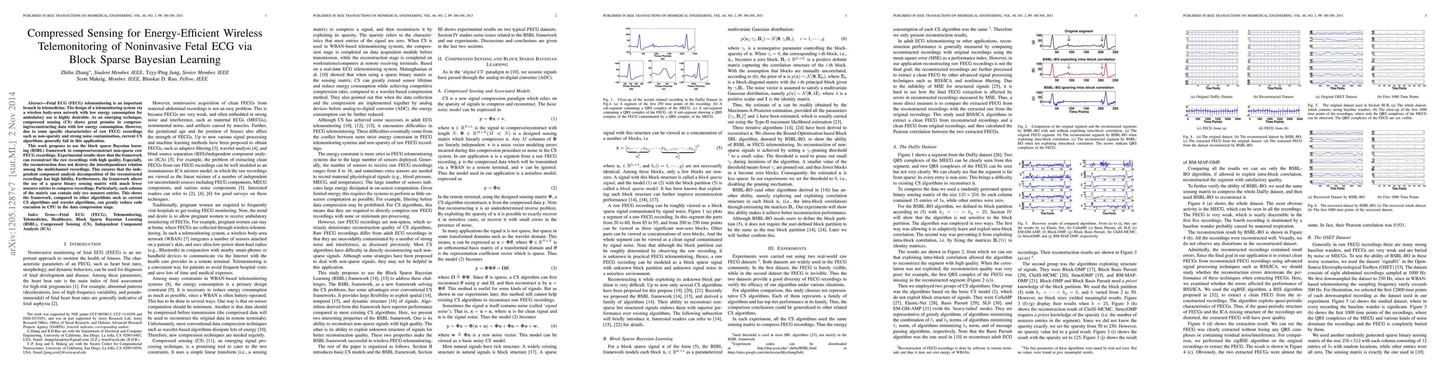 This paper proposes using block sparse Bayesian learning (BSBL) for compressed sensing in energy-efficient wireless telemonitoring of noninvasive fetal ECG. The BSBL framework effectively compresses and reconstructs non-sparse, noisy fetal ECG recordings with high fidelity, significantly reducing energy consumption compared to existing compressed sensing and wavelet algorithms.