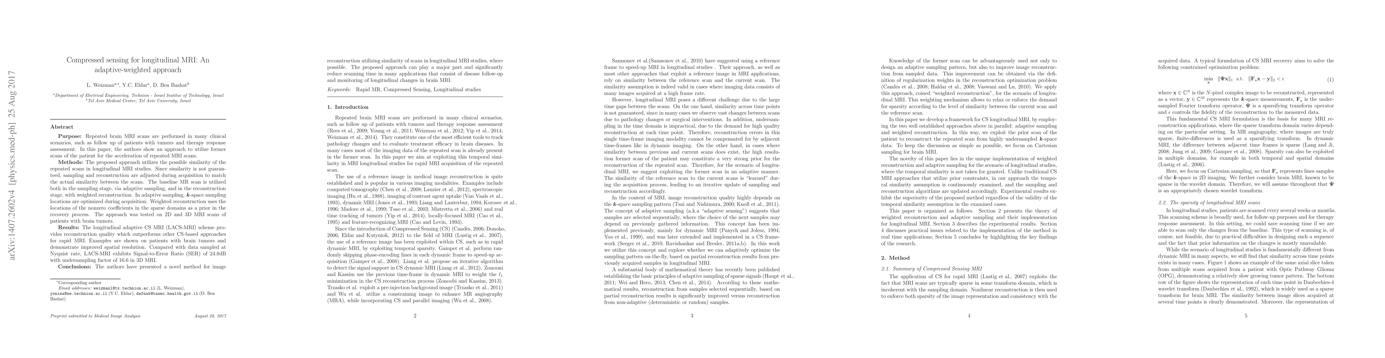This paper proposes an adaptive-weighted compressed sensing approach for longitudinal MRI scans, utilizing prior scans to accelerate acquisition. The adaptive sampling and weighted reconstruction methods improve reconstruction quality, demonstrating superior spatial resolution and a Signal-to-Error Ratio of 24.8dB with an undersampling factor of 16.6 in 3D MRI.