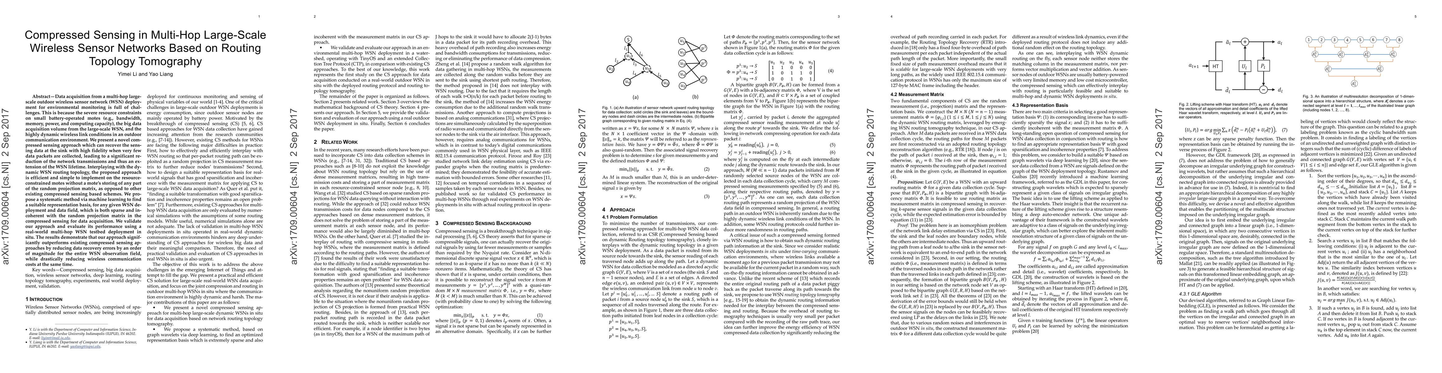 This paper presents a compressed sensing method for multi-hop large-scale wireless sensor networks to efficiently acquire environmental monitoring data under severe resource constraints. The proposed approach significantly reduces network transmissions and extends network lifetime by leveraging dynamic routing topology and machine learning to find a suitable sparse representation basis.