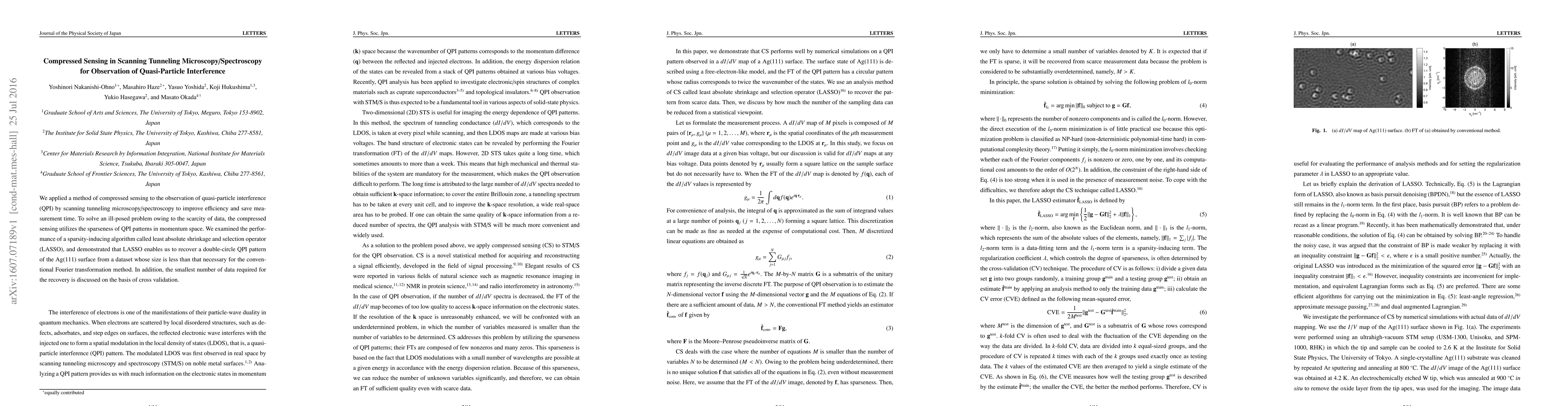 This paper applies compressed sensing, utilizing the least absolute shrinkage and selection operator (LASSO), to enhance scanning tunneling microscopy/spectroscopy for observing quasi-particle interference (QPI). The method effectively recovers complex QPI patterns, such as a double-circle pattern on Ag(111), from significantly reduced datasets, thus saving measurement time.