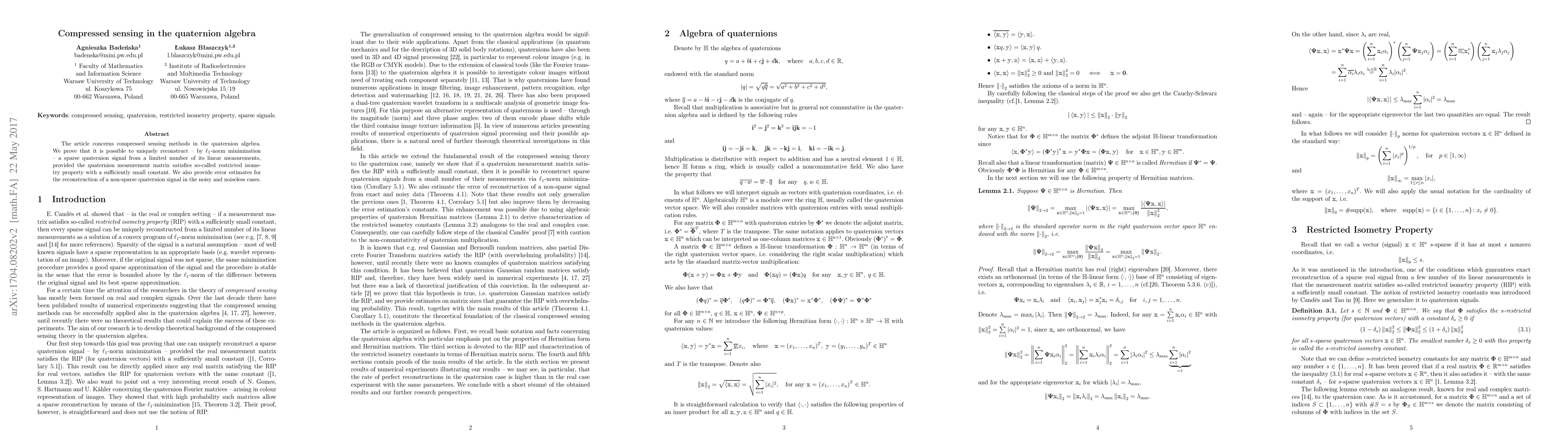 Research proves compressed sensing can uniquely reconstruct sparse quaternion signals from limited measurements if a specific matrix property is met, with error estimates provided for both noiseless and noisy cases.