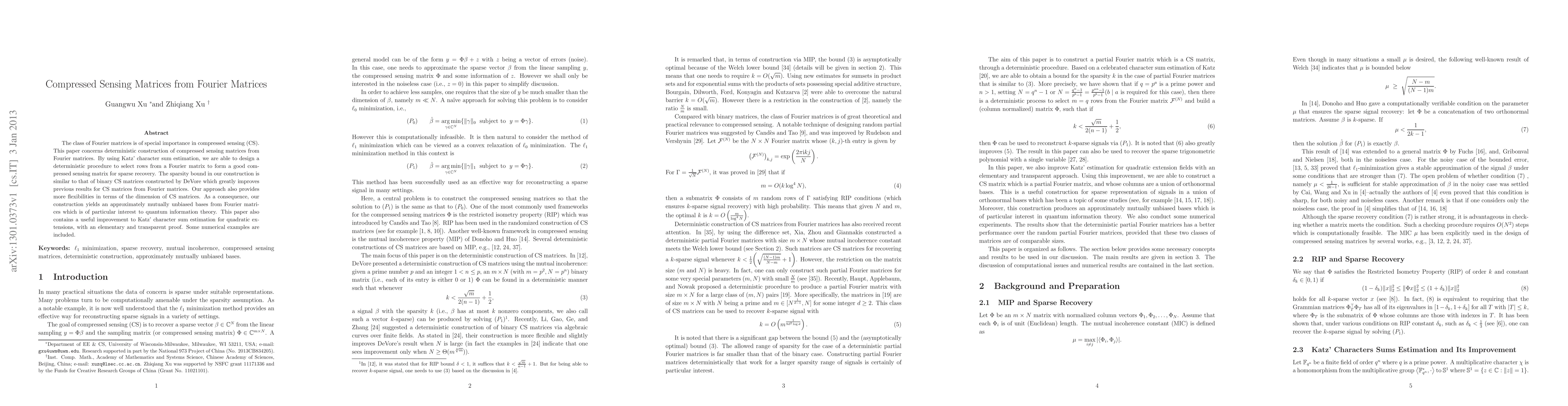 This paper presents a deterministic method to construct compressed sensing matrices from Fourier matrices, leveraging Katz' character sum estimation. The resulting matrices achieve a sparsity bound comparable to binary CS matrices, offering flexibility in dimensions and yielding approximately mutually unbiased bases relevant to quantum information theory.