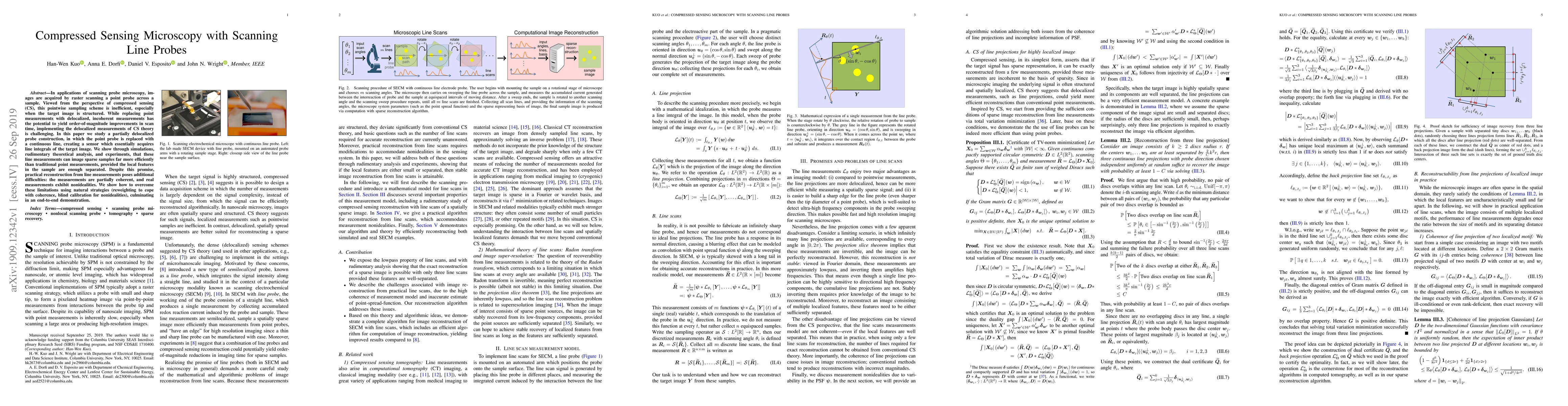 This paper explores the use of compressed sensing microscopy with scanning line probes to efficiently image sparse samples by acquiring line integrals instead of point measurements. The study demonstrates that line measurements can significantly reduce scan time, though practical reconstruction requires strategies to address coherence and nonidealities.