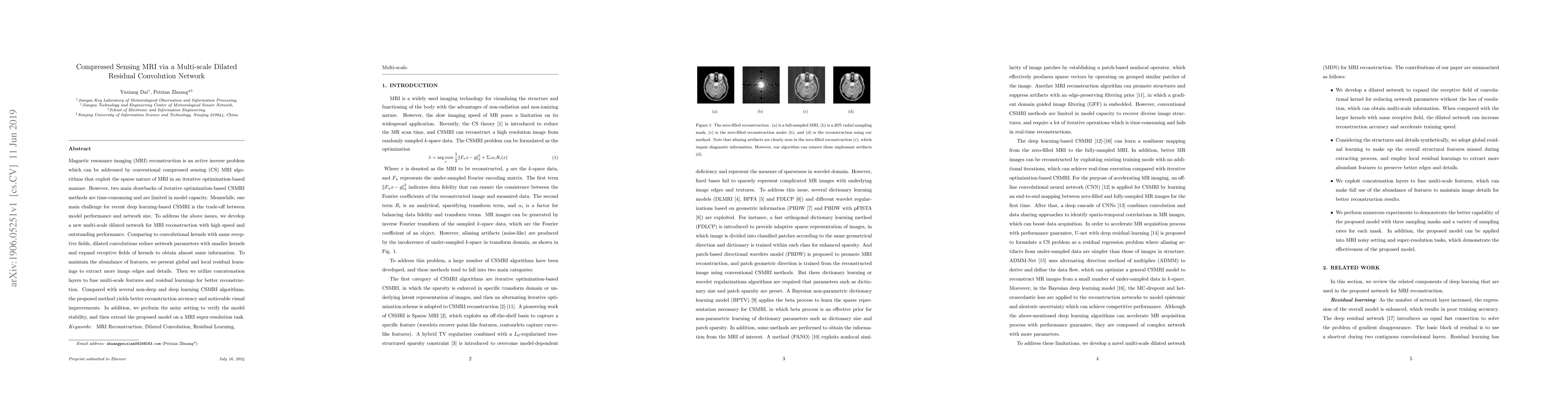 This paper proposes a multi-scale dilated residual convolutional network for fast and high-quality compressed sensing MRI reconstruction, addressing the limitations of iterative optimization-based methods and balancing performance with model size. The method achieves better reconstruction accuracy and visual quality compared to existing algorithms.
