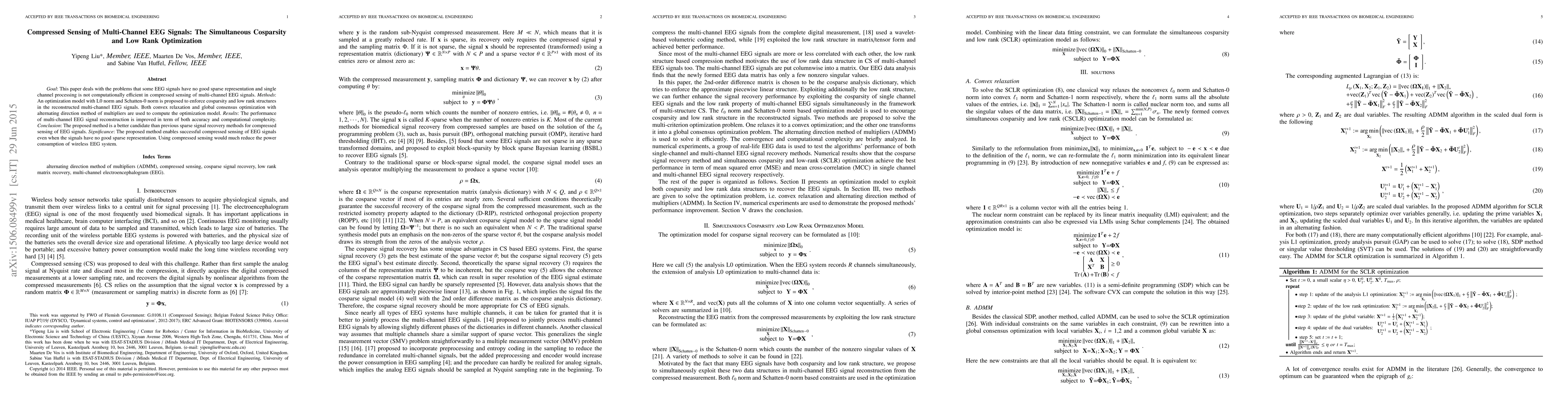 This paper proposes an optimization model using L0 norm and Schatten-0 norm for compressed sensing of multi-channel EEG signals, improving both reconstruction accuracy and computational efficiency. The method outperforms previous sparse signal recovery techniques, enabling effective compressed sensing even for signals lacking good sparse representation.