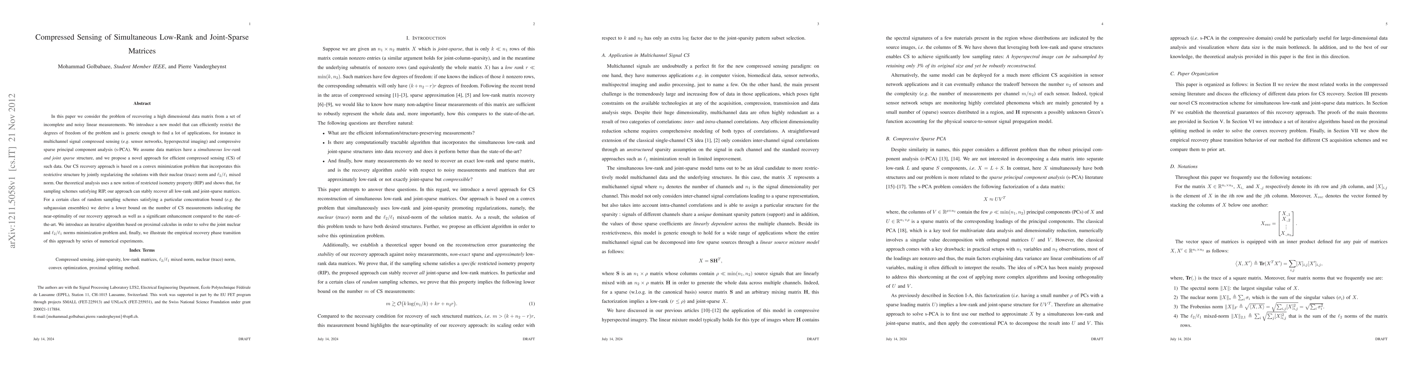 This paper proposes a novel compressed sensing approach for recovering high-dimensional data matrices with simultaneous low-rank and joint-sparse structures, using a convex minimization problem that jointly regularizes with nuclear and l2/l1 norms. The theoretical analysis demonstrates stable recovery under certain sampling schemes and shows near-optimality compared to existing methods.