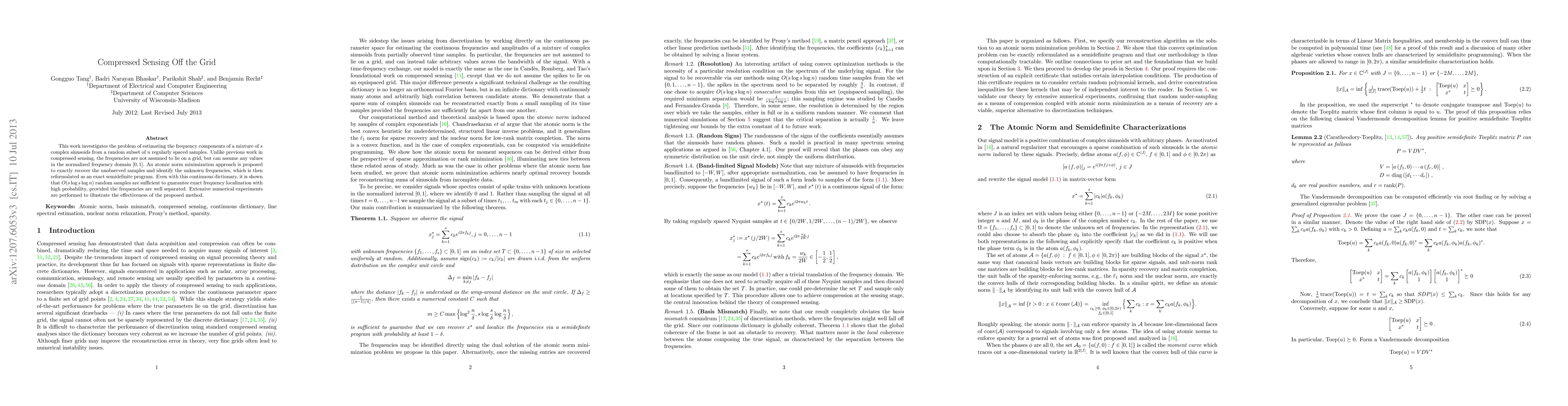 We consider the problem of estimating the frequency components of a mixture of s complex sinusoids from a random subset of n regularly spaced samples. Unlike previous work in compressed sensing, the frequencies are not assumed to lie on a grid, but can assume any values in the normalized frequency domain [0,1]. We propose an atomic norm minimization approach to exactly recover the unobserved samples. We reformulate this atomic norm minimization as an exact semidefinite program. Even with this continuous dictionary, we show that most sampling sets of size O(s log s log n) are sufficient to guarantee the exact frequency estimation with high probability, provided the frequencies are well separated. Numerical experiments are performed to illustrate the effectiveness of the proposed method.