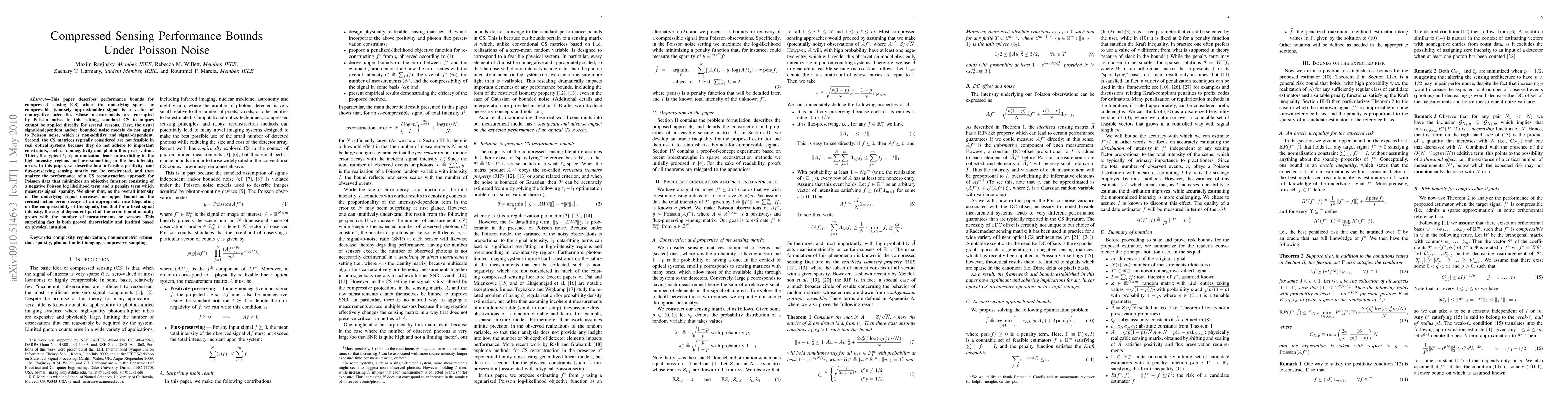 This paper investigates compressed sensing performance under Poisson noise, proposing a novel reconstruction approach that constructs a positivity- and flux-preserving sensing matrix. It demonstrates that while reconstruction error bounds decay with increasing signal intensity, they paradoxically increase with more measurements for fixed intensity, a result supported by theoretical and physical analysis.