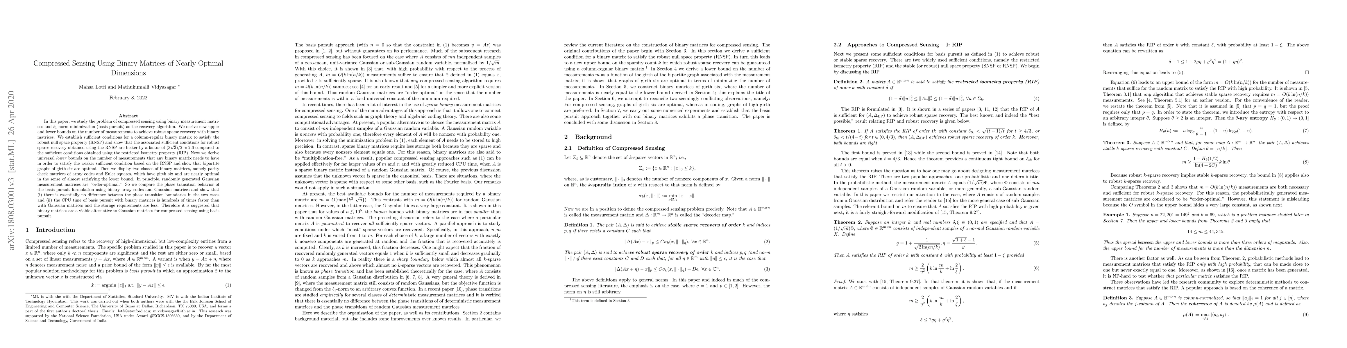 In this paper, we study the problem of compressed sensing using binary measurement matrices and $\ell_1$-norm minimization (basis pursuit) as the recovery algorithm. We derive new upper and lower bounds on the number of measurements to achieve robust sparse recovery with binary matrices. We establish sufficient conditions for a column-regular binary matrix to satisfy the robust null space property (RNSP) and show that the associated sufficient conditions % sparsity bounds for robust sparse recovery obtained using the RNSP are better by a factor of $(3 \sqrt{3})/2 \approx 2.6$ compared to the sufficient conditions obtained using the restricted isometry property (RIP). Next we derive universal \textit{lower} bounds on the number of measurements that any binary matrix needs to have in order to satisfy the weaker sufficient condition based on the RNSP and show that bipartite graphs of girth six are optimal. Then we display two classes of binary matrices, namely parity check matrices of array codes and Euler squares, which have girth six and are nearly optimal in the sense of almost satisfying the lower bound. In principle, randomly generated Gaussian measurement matrices are "order-optimal". So we compare the phase transition behavior of the basis pursuit formulation using binary array codes and Gaussian matrices and show that (i) there is essentially no difference between the phase transition boundaries in the two cases and (ii) the CPU time of basis pursuit with binary matrices is hundreds of times faster than with Gaussian matrices and the storage requirements are less. Therefore it is suggested that binary matrices are a viable alternative to Gaussian matrices for compressed sensing using basis pursuit. \end{abstract}