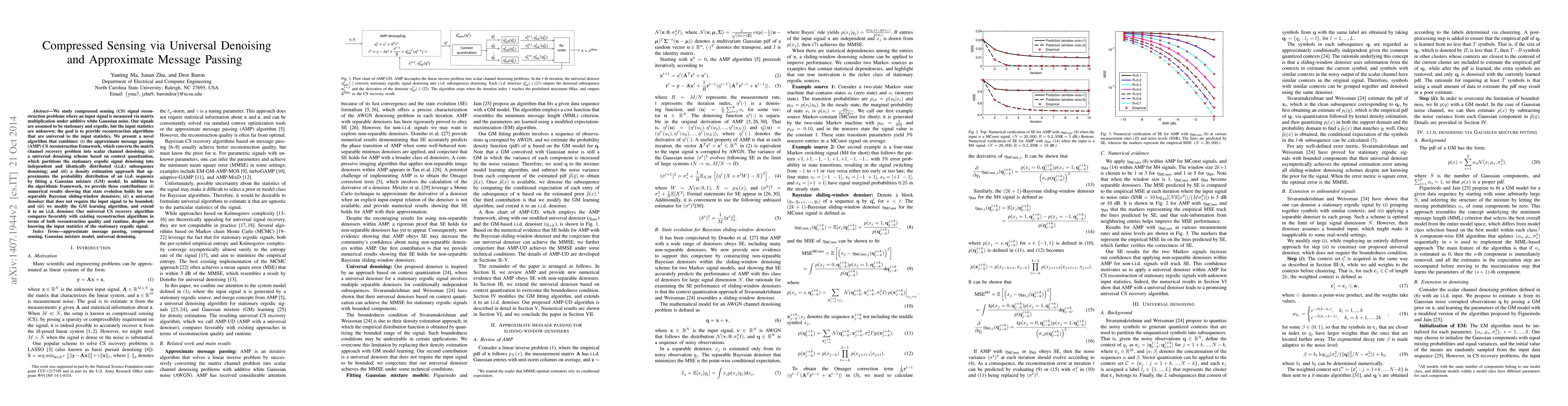 This paper proposes a novel compressed sensing reconstruction algorithm that combines approximate message passing with universal denoising and Gaussian mixture modeling to handle unknown input signal statistics. The algorithm achieves competitive reconstruction quality and runtime compared to existing methods.