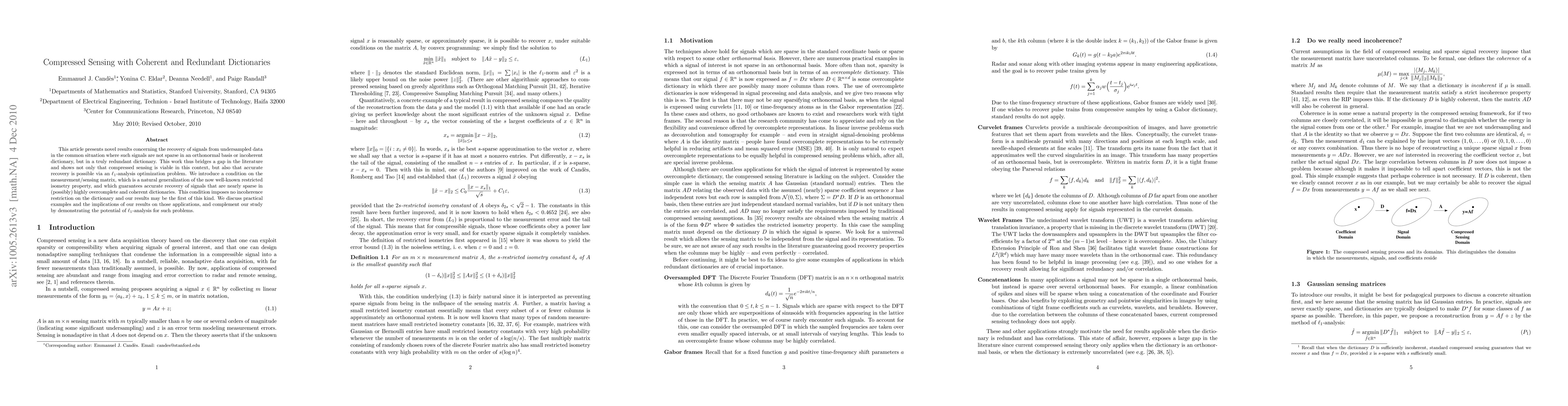 This article presents novel results concerning the recovery of signals from undersampled data in the common situation where such signals are not sparse in an orthonormal basis or incoherent dictionary, but in a truly redundant dictionary. This work thus bridges a gap in the literature and shows not only that compressed sensing is viable in this context, but also that accurate recovery is possible via an L1-analysis optimization problem. We introduce a condition on the measurement/sensing matrix, which is a natural generalization of the now well-known restricted isometry property, and which guarantees accurate recovery of signals that are nearly sparse in (possibly) highly overcomplete and coherent dictionaries. This condition imposes no incoherence restriction on the dictionary and our results may be the first of this kind. We discuss practical examples and the implications of our results on those applications, and complement our study by demonstrating the potential of L1-analysis for such problems.