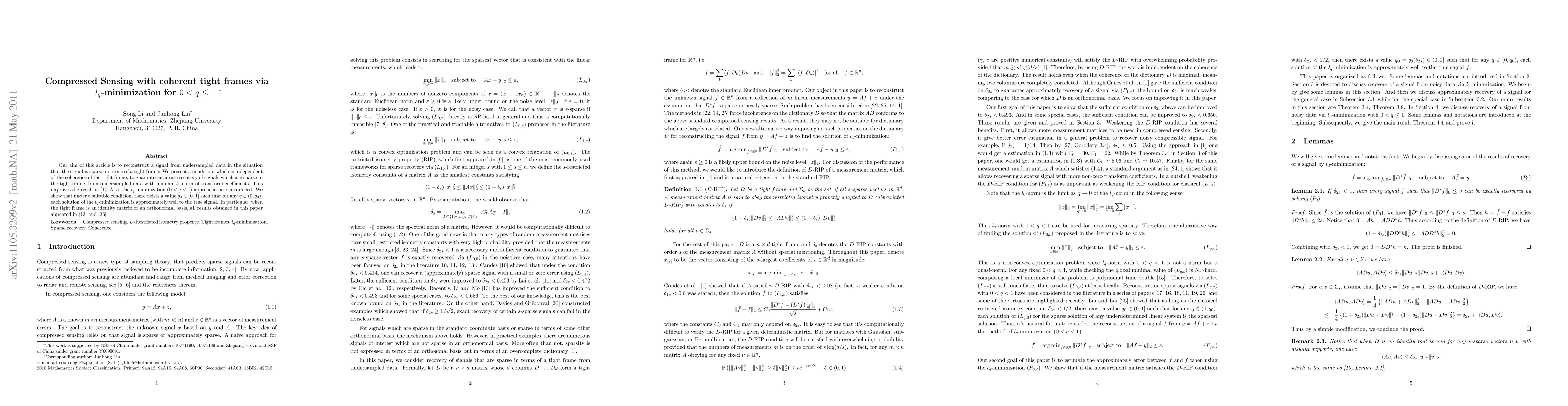 improves the result in [1]. Also, the $l_q$-minimization $(0