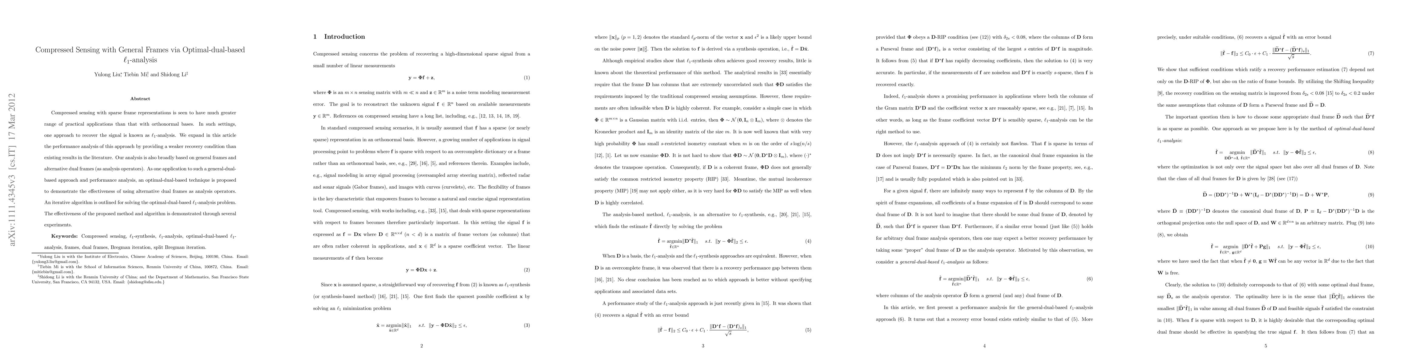 Researchers improve the performance of a technique called $ell_1$-analysis for recovering signals in compressed sensing with general frames, introducing an optimal-dual-based method to demonstrate its effectiveness.