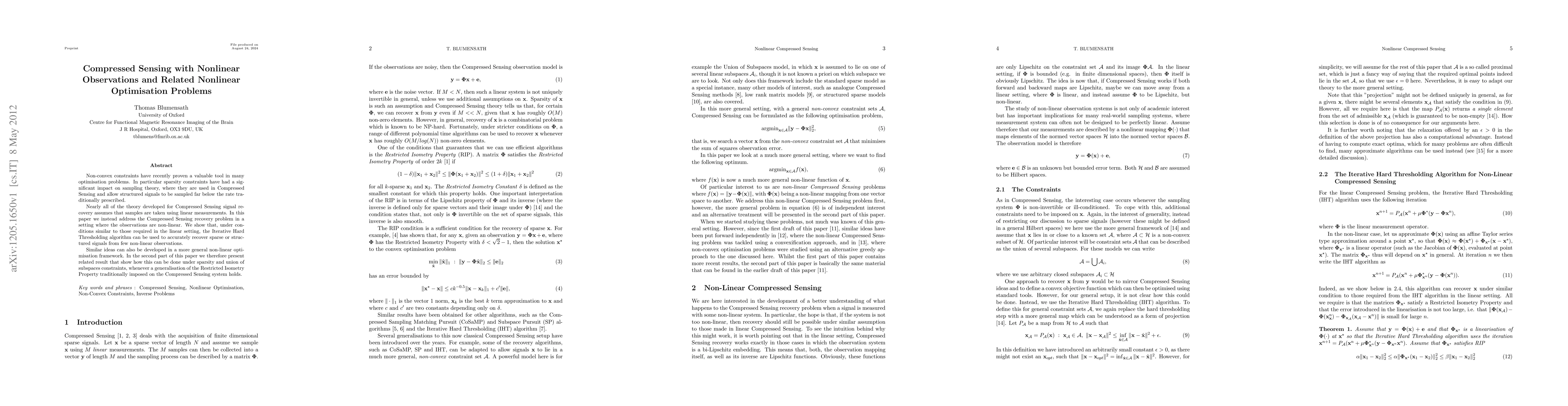 Non-convex constraints have recently proven a valuable tool in many optimisation problems. In particular sparsity constraints have had a significant impact on sampling theory, where they are used in Compressed Sensing and allow structured signals to be sampled far below the rate traditionally prescribed. Nearly all of the theory developed for Compressed Sensing signal recovery assumes that samples are taken using linear measurements. In this paper we instead address the Compressed Sensing recovery problem in a setting where the observations are non-linear. We show that, under conditions similar to those required in the linear setting, the Iterative Hard Thresholding algorithm can be used to accurately recover sparse or structured signals from few non-linear observations. Similar ideas can also be developed in a more general non-linear optimisation framework. In the second part of this paper we therefore present related result that show how this can be done under sparsity and union of subspaces constraints, whenever a generalisation of the Restricted Isometry Property traditionally imposed on the Compressed Sensing system holds.