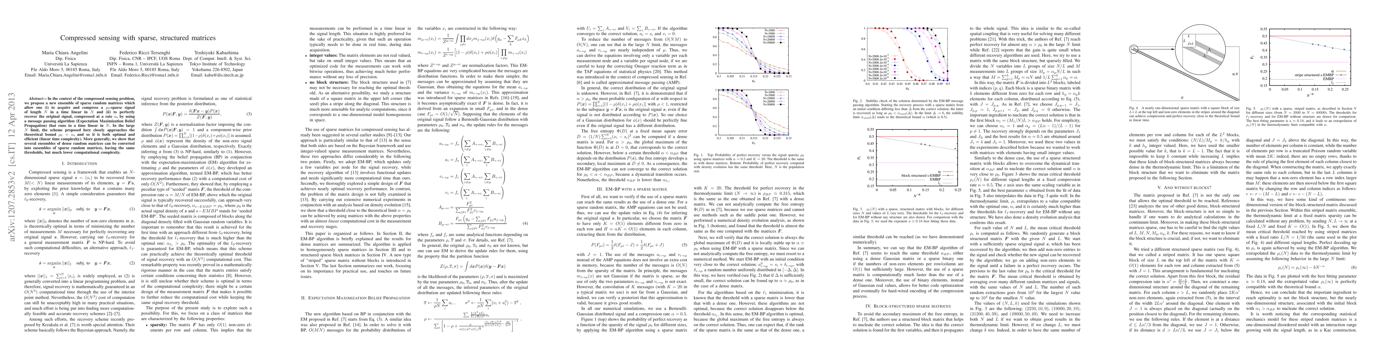 In the context of the compressed sensing problem, we propose a new ensemble of sparse random matrices which allow one (i) to acquire and compress a {\rho}0-sparse signal of length N in a time linear in N and (ii) to perfectly recover the original signal, compressed at a rate {\alpha}, by using a message passing algorithm (Expectation Maximization Belief Propagation) that runs in a time linear in N. In the large N limit, the scheme proposed here closely approaches the theoretical bound {\rho}0 = {\alpha}, and so it is both optimal and efficient (linear time complexity). More generally, we show that several ensembles of dense random matrices can be converted into ensembles of sparse random matrices, having the same thresholds, but much lower computational complexity.