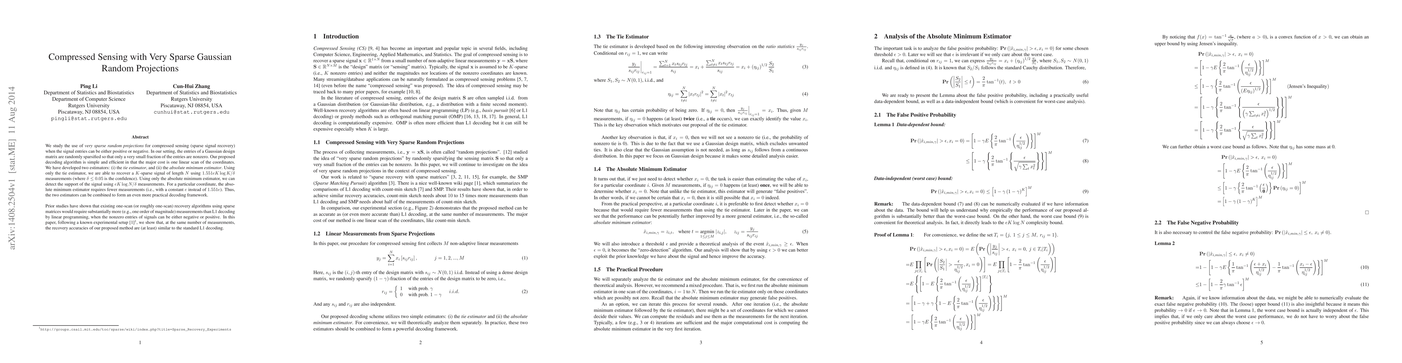 We study the use of very sparse random projections for compressed sensing (sparse signal recovery) when the signal entries can be either positive or negative. In our setting, the entries of a Gaussian design matrix are randomly sparsified so that only a very small fraction of the entries are nonzero. Our proposed decoding algorithm is simple and efficient in that the major cost is one linear scan of the coordinates. We have developed two estimators: (i) the {\em tie estimator}, and (ii) the {\em absolute minimum estimator}. Using only the tie estimator, we are able to recover a $K$-sparse signal of length $N$ using $1.551 eK \log K/\delta$ measurements (where $\delta\leq 0.05$ is the confidence). Using only the absolute minimum estimator, we can detect the support of the signal using $eK\log N/\delta$ measurements. For a particular coordinate, the absolute minimum estimator requires fewer measurements (i.e., with a constant $e$ instead of $1.551e$). Thus, the two estimators can be combined to form an even more practical decoding framework. Prior studies have shown that existing one-scan (or roughly one-scan) recovery algorithms using sparse matrices would require substantially more (e.g., one order of magnitude) measurements than L1 decoding by linear programming, when the nonzero entries of signals can be either negative or positive. In this paper, following a known experimental setup, we show that, at the same number of measurements, the recovery accuracies of our proposed method are (at least) similar to the standard L1 decoding.