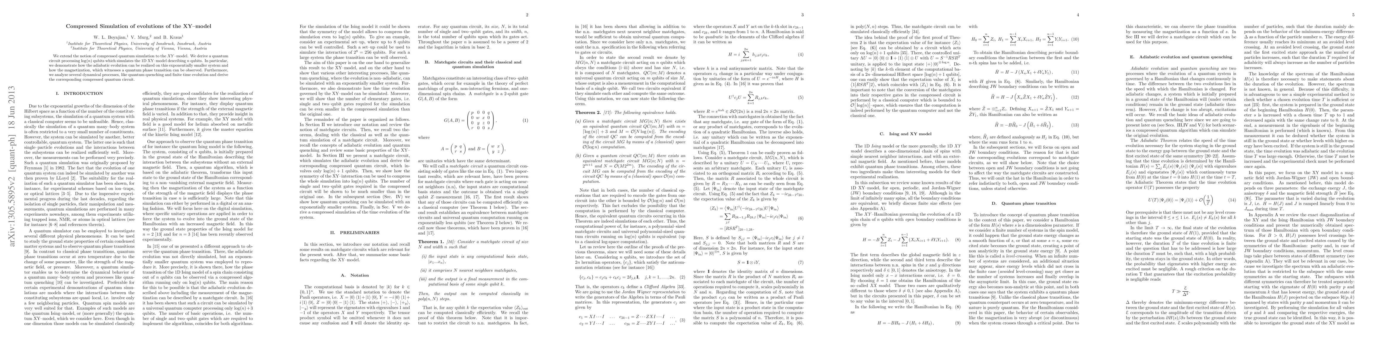 We extend the notion of compressed quantum simulation to the XY-model. We derive a quantum circuit processing log(n) qubits which simulates the 1D XY-model describing n qubits. In particular, we demonstrate how the adiabatic evolution can be realized on this exponentially smaller system and how the magnetization, which witnesses a quantum phase transition can be observed. Furthermore, we analyze several dynamical processes, like quantum quenching and finite time evolution and derive the corresponding compressed quantum circuit.