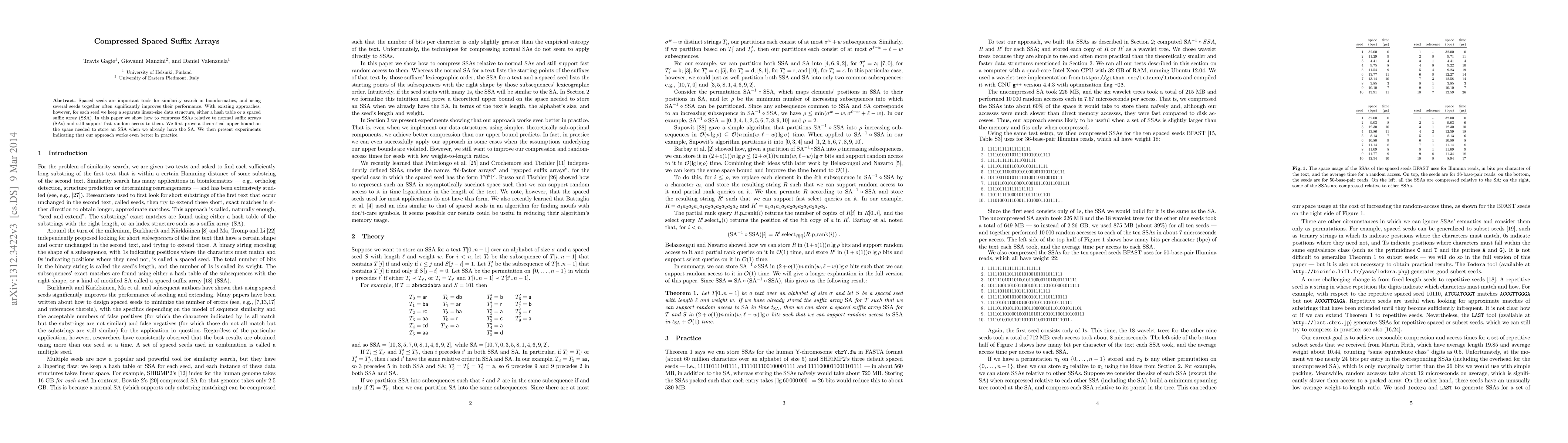 This paper proposes a method to compress spaced suffix arrays (SSAs) while maintaining fast access, improving upon existing approaches that use separate linear-size data structures for each seed. Experimental results show that the method not only meets theoretical upper bounds but also performs better in practice.