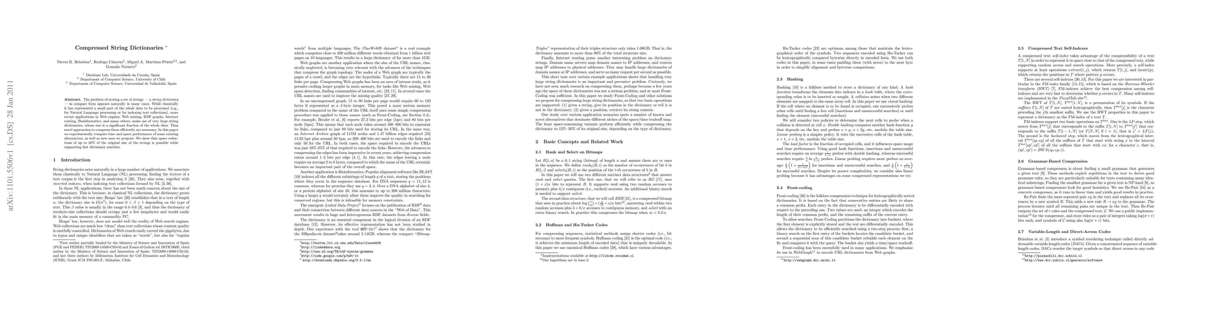 This paper investigates efficient compression methods for large string dictionaries, crucial for applications like web mining and bioinformatics. It compares existing and proposed techniques, demonstrating up to 20% space reduction while maintaining fast search performance.