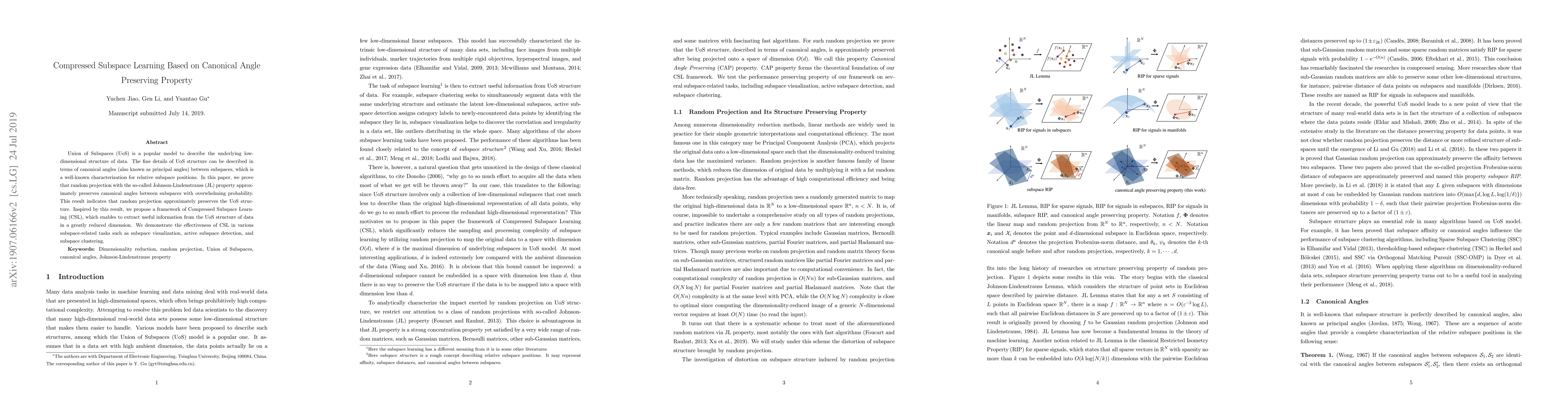 Union of Subspaces (UoS) is a popular model to describe the underlying low-dimensional structure of data. The fine details of UoS structure can be described in terms of canonical angles (also known as principal angles) between subspaces, which is a well-known characterization for relative subspace positions. In this paper, we prove that random projection with the so-called Johnson-Lindenstrauss (JL) property approximately preserves canonical angles between subspaces with overwhelming probability. This result indicates that random projection approximately preserves the UoS structure. Inspired by this result, we propose a framework of Compressed Subspace Learning (CSL), which enables to extract useful information from the UoS structure of data in a greatly reduced dimension. We demonstrate the effectiveness of CSL in various subspace-related tasks such as subspace visualization, active subspace detection, and subspace clustering.