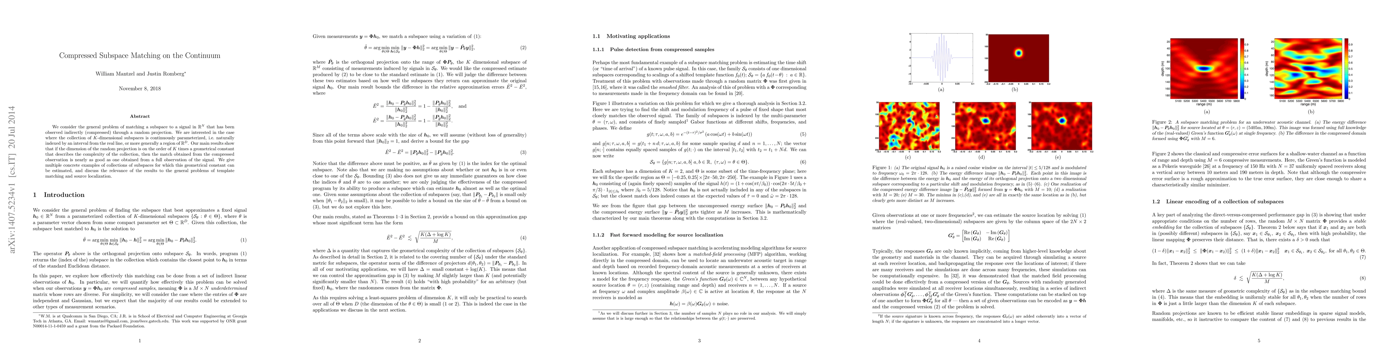 This paper investigates the problem of matching a continuously parameterized subspace to a signal observed through a random projection, demonstrating that with sufficient projection dimension, the match from compressed data is nearly as accurate as from full data. It provides examples of subspace collections and discusses implications for template matching and source localization.