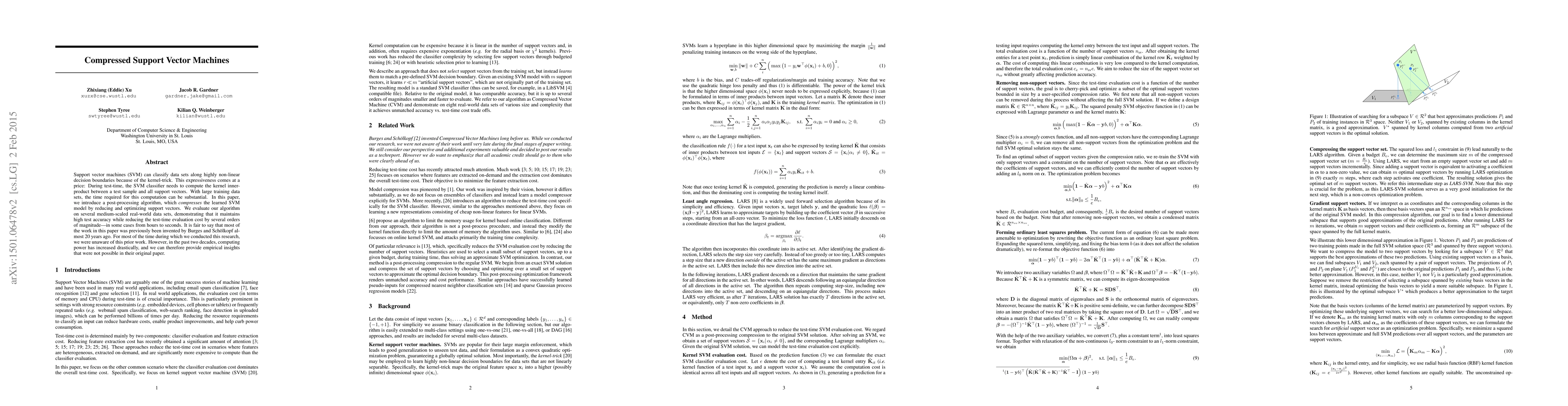A new algorithm reduces the time required to evaluate Support Vector Machines during testing by compressing learned support vectors, resulting in significant speed improvements with minimal loss of accuracy.