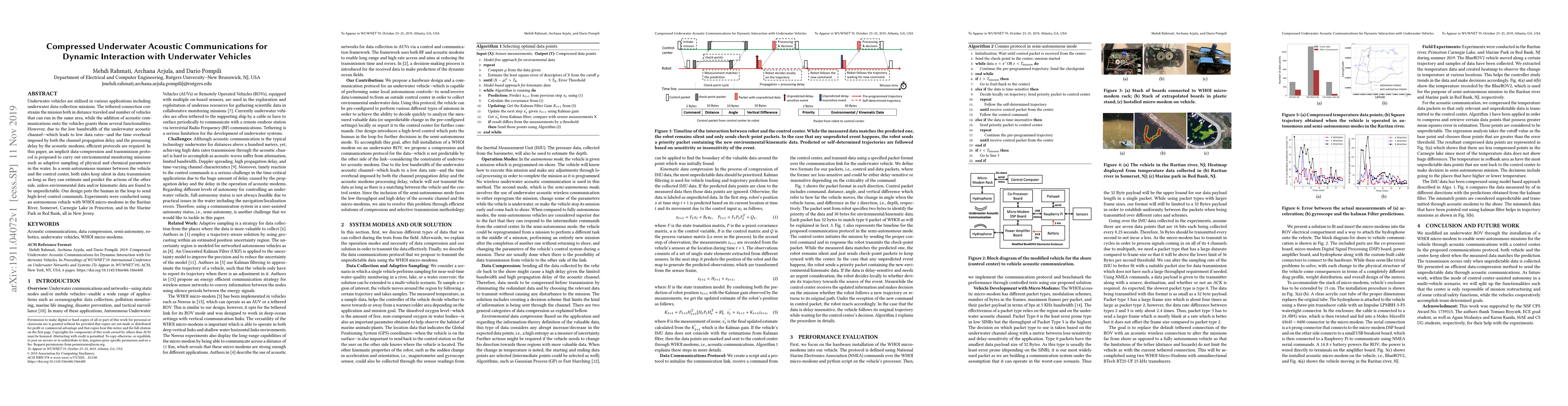 Underwater vehicles are utilized in various applications including underwater data-collection missions. The tethered connection constrains the mission both in distance traveled and number of vehicles that can run in the same area, while the addition of acoustic communications onto the vehicles grants them several functionalities. However, due to the low bandwidth of the underwater acoustic channel-which leads to low data rates-and the time overhead imposed by both the channel propagation delay and the processing delay by the acoustic modems, efficient protocols are required. In this paper, an implicit data-compression and transmission protocol is proposed to carry out environmental monitoring missions such as adaptive sampling of physical and chemical parameters in the water. In a semi-autonomous manner between the vehicle and the control center, both sides keep silent in data transmission as long as they can estimate and predict the actions of the other side, unless environmental data and/or kinematic data are found to be unpredictable. Our design puts the human in the loop to send high-level control commands. Experiments were conducted using an autonomous vehicle with WHOI micro-modems in the Raritan River, Somerset, Carnegie Lake in Princeton, and in the Marine Park in Red Bank, all in New Jersey.