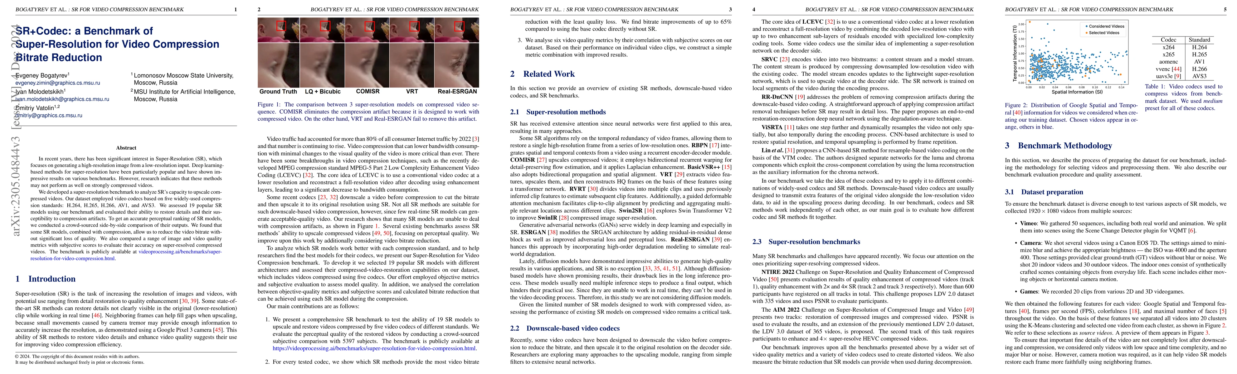 This paper introduces a super-resolution benchmark for evaluating the quality of upscaled compressed videos using five video codecs. It assesses 17 state-of-the-art SR models and develops an objective quality metric that correlates well with subjective perceptual rankings.