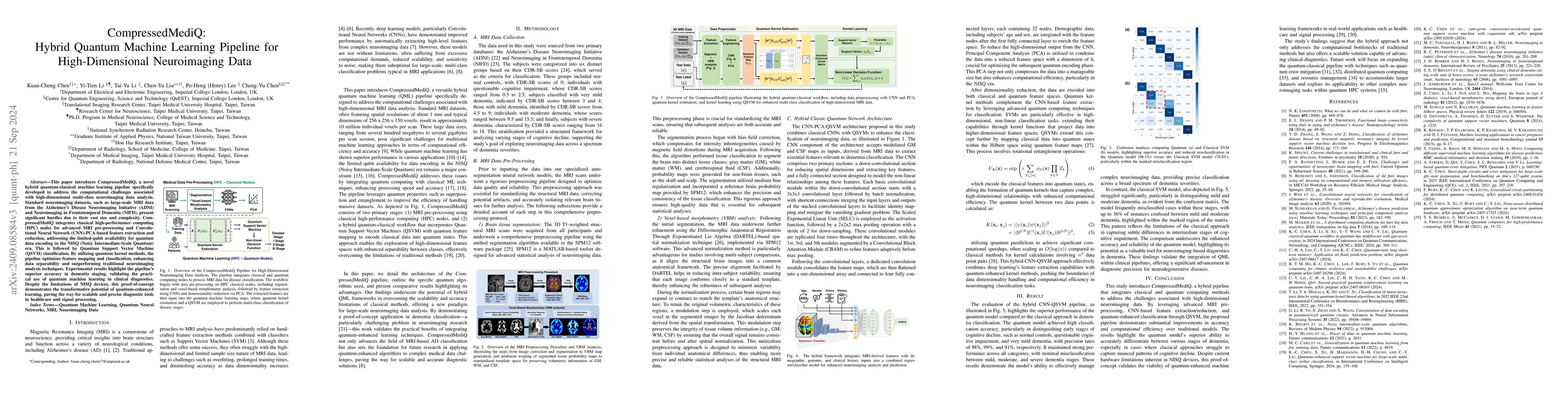 This paper introduces CompressedMediQ, a novel hybrid quantum-classical machine learning pipeline specifically developed to address the computational challenges associated with high-dimensional multi-class neuroimaging data analysis. Standard neuroimaging datasets, such as 4D MRI data from the Alzheimer's Disease Neuroimaging Initiative (ADNI) and Neuroimaging in Frontotemporal Dementia (NIFD), present significant hurdles due to their vast size and complexity. CompressedMediQ integrates classical high-performance computing (HPC) nodes for advanced MRI pre-processing and Convolutional Neural Network (CNN)-PCA-based feature extraction and reduction, addressing the limited-qubit availability for quantum data encoding in the NISQ (Noisy Intermediate-Scale Quantum) era. This is followed by Quantum Support Vector Machine (QSVM) classification. By utilizing quantum kernel methods, the pipeline optimizes feature mapping and classification, enhancing data separability and outperforming traditional neuroimaging analysis techniques. Experimental results highlight the pipeline's superior accuracy in dementia staging, validating the practical use of quantum machine learning in clinical diagnostics. Despite the limitations of NISQ devices, this proof-of-concept demonstrates the transformative potential of quantum-enhanced learning, paving the way for scalable and precise diagnostic tools in healthcare and signal processing.