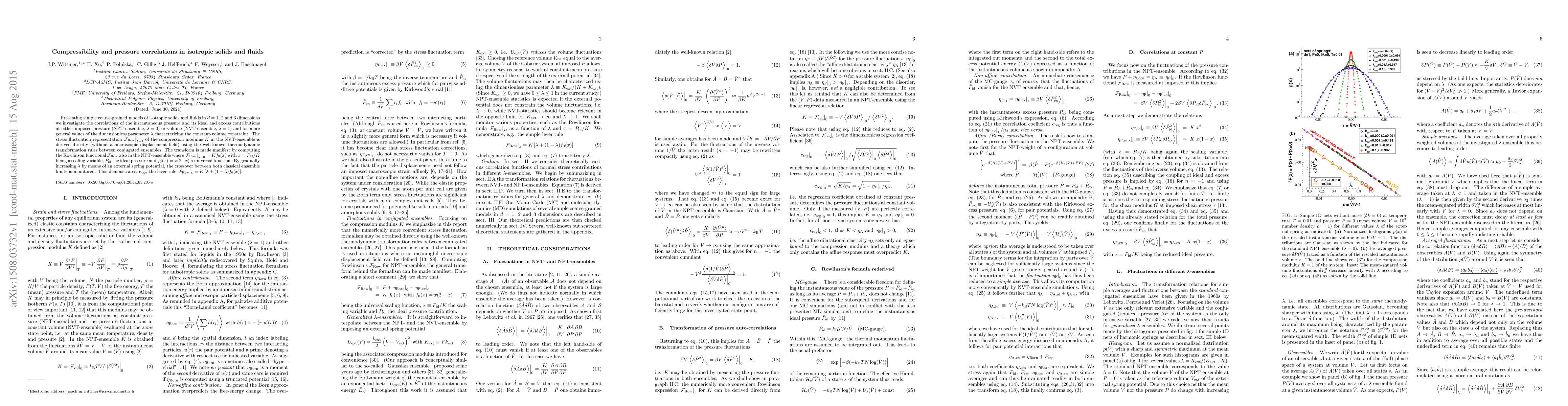 This research explores coarse-grained models of isotropic solids and fluids in 1D, 2D, and 3D dimensions, investigating pressure correlations under varying ensembles and constraint parameters. It offers insights into ideal and excess pressure contributions, beneficial for understanding material compressibility.