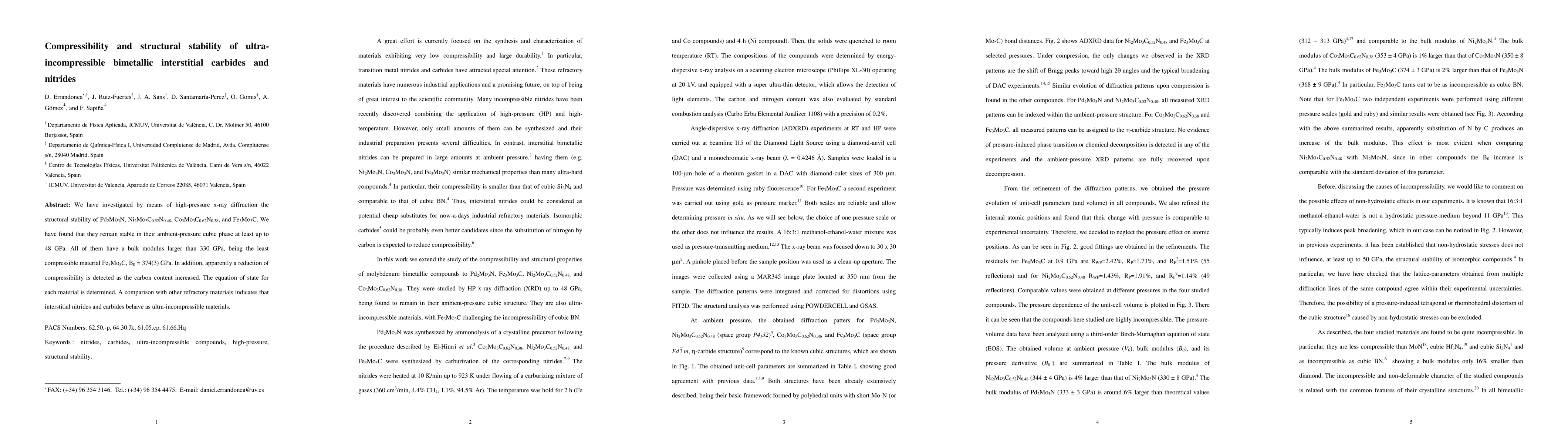 This study investigates the structural stability and compressibility of several bimetallic interstitial carbides and nitrides under high pressure using X-ray diffraction. The materials remain stable in their cubic phase up to 48 GPa, with bulk moduli exceeding 330 GPa, indicating their ultra-incompressible nature.