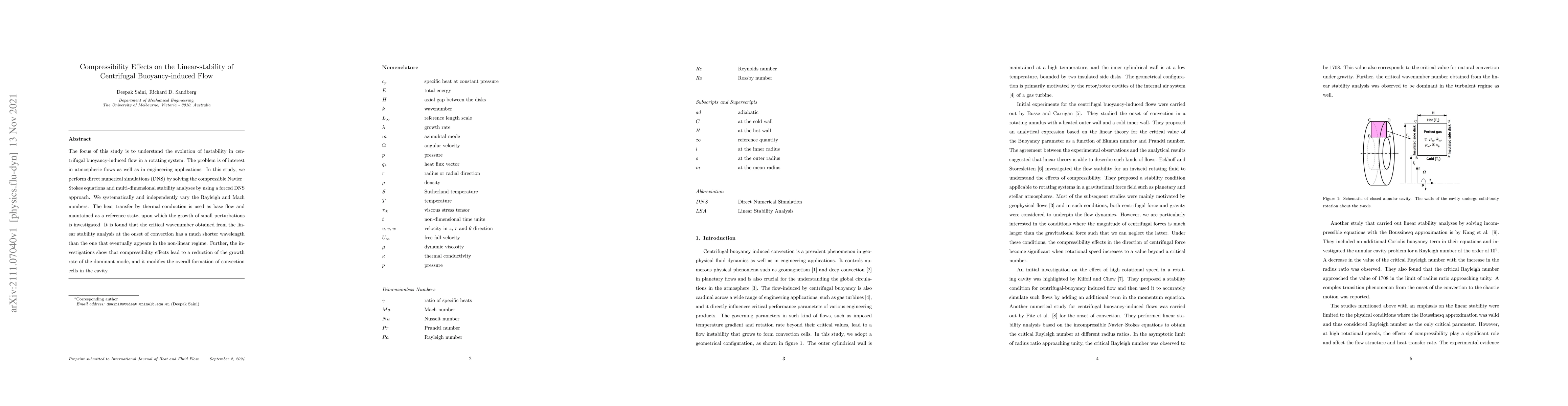 This study investigates how compressibility affects the linear stability of centrifugal buoyancy-induced flow in rotating systems, finding that it reduces growth rates and alters convection cell formation.