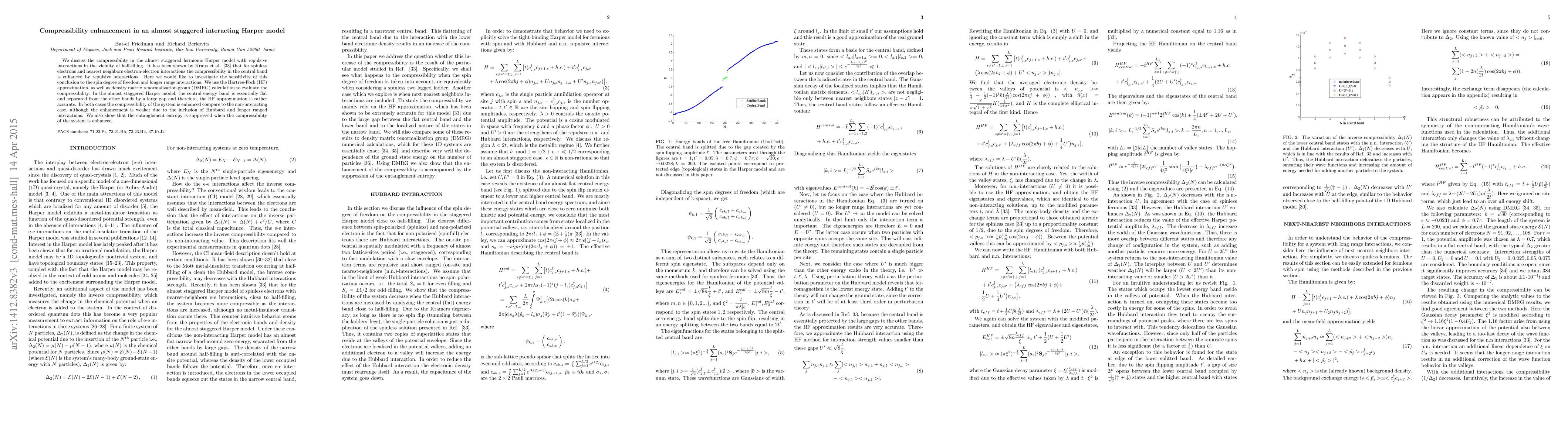 We discuss the compressibility in the almost staggered fermionic Harper model with repulsive interactions in the vicinity of half-filling. It has been shown by Kraus et al. [33] that for spinless electrons and nearest neighbors electron-electron interactions the compressibility in the central band is enhanced by repulsive interactions. Here we would like to investigate the sensitivity of this conclusion to the spin degree of freedom and longer range interactions. We use the Hartree-Fock (HF) approximation, as well as density matrix renormalization group (DMRG) calculation to evaluate the compressibility. In the almost staggered Harper model, the central energy band is essentially flat and separated from the other bands by a large gap and therefore, the HF approximation is rather accurate.In both cases the compressibility of the system is enhanced compare to the non-interacting case, although the enhancement is weaker due to the inclusion of Hubbard and longer ranged interactions.
